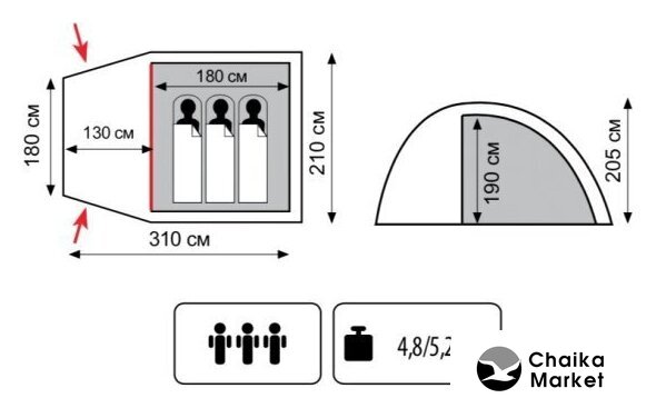 кемпинговая, весна/лето/осень, 2-местная, 2 входа, 1 комната, противомоскитная сетка, тамбур, штормовые оттяжки, ДхШхВ: 310x210x110 см