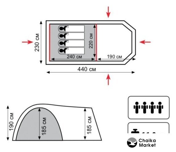 кемпинговая, зима/весна/лето/осень, 4-местная, 2 входа, 1 комната, противомоскитная сетка, тамбур, штормовые оттяжки, ДхШхВ: 365x260x205 см