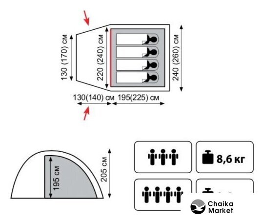 кемпинговая, весна/лето/осень, 2 входа, 1 комната, противомоскитная сетка, штормовые оттяжки, ДхШхВ: 430x370x225 см
