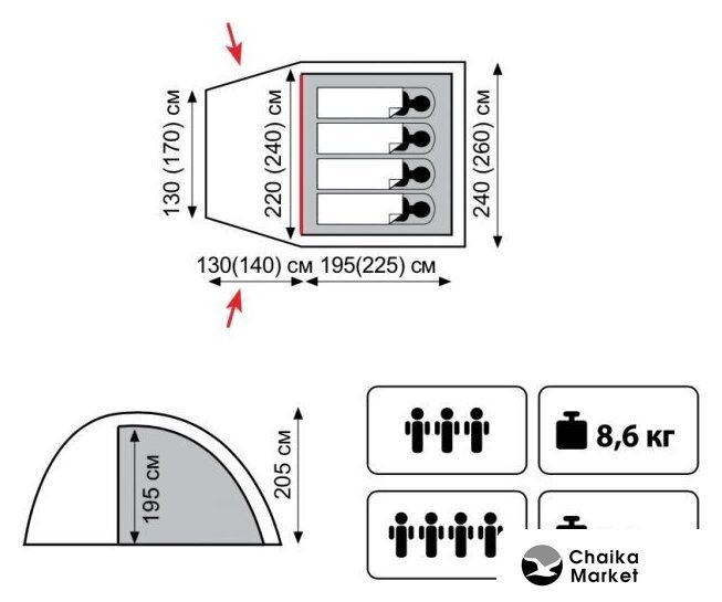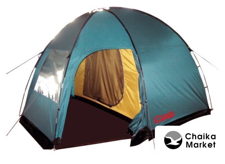 кемпинговая, весна/лето/осень, 4-местная, 3 входа, 1 комната, противомоскитная сетка, тамбур, штормовые оттяжки, ДхШхВ: 440x230x190 см