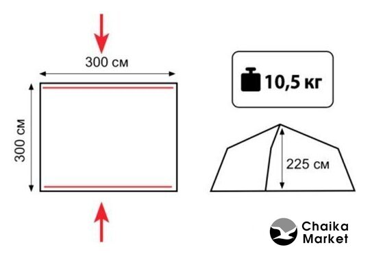 кемпинговая, весна/лето/осень, 3-местная, 2 входа, 1 комната, противомоскитная сетка, тамбур, штормовые оттяжки, ДхШхВ: 325x240x205 см