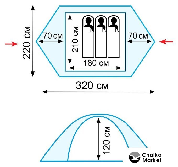 треккинговая, весна/лето/осень, 3-местная, 2 входа, 1 комната, противомоскитная сетка, тамбур, штормовые оттяжки, ДхШхВ: 490x220x130 см