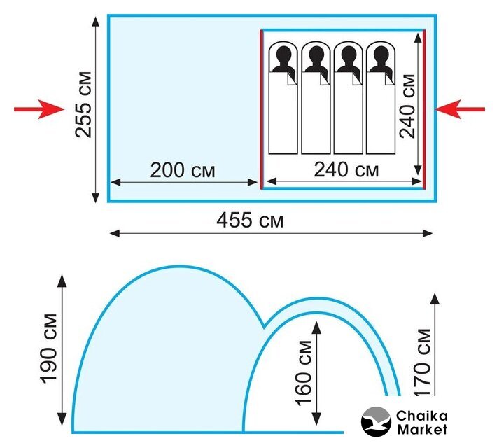 кемпинговая, весна/лето/осень, 2 входа, 1 комната, противомоскитная сетка, ДхШхВ: 430x370x225 см