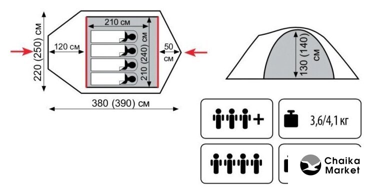 треккинговая, весна/лето/осень, 4-местная, 2 входа, 1 комната, противомоскитная сетка, тамбур, штормовые оттяжки, ДхШхВ: 390x250x140 см