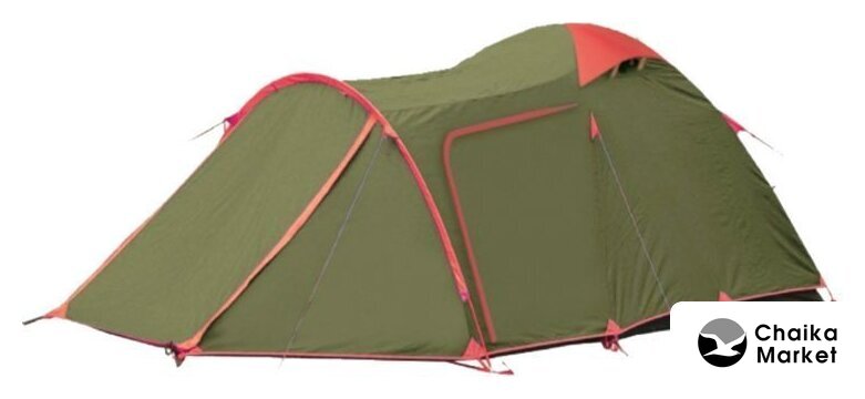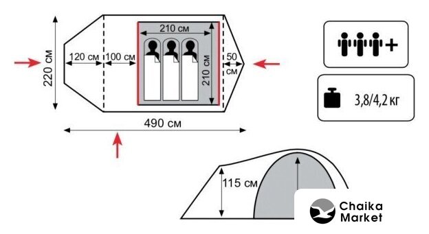 треккинговая, весна/лето/осень, 4-местная, 2 входа, 1 комната, противомоскитная сетка, тамбур, штормовые оттяжки, ДхШхВ: 390x250x140 см