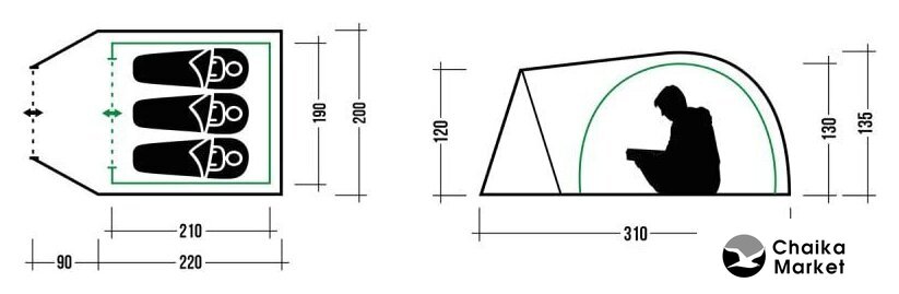 кемпинговая, весна/лето/осень, 4-местная, 2 входа, 1 комната, противомоскитная сетка, тамбур, штормовые оттяжки, ДхШхВ: 360x250x140 см