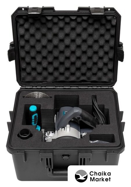 | Комплектация | Циркулярный электроплиткорез3 присоски для шероховатых поверхностей2 алмазных диска для сухой резкиНабор вспомогательных аксессуаровАдаптер для пылесосов других марок (Ø37, 42 и 50 мм)Пластиковый кейс |