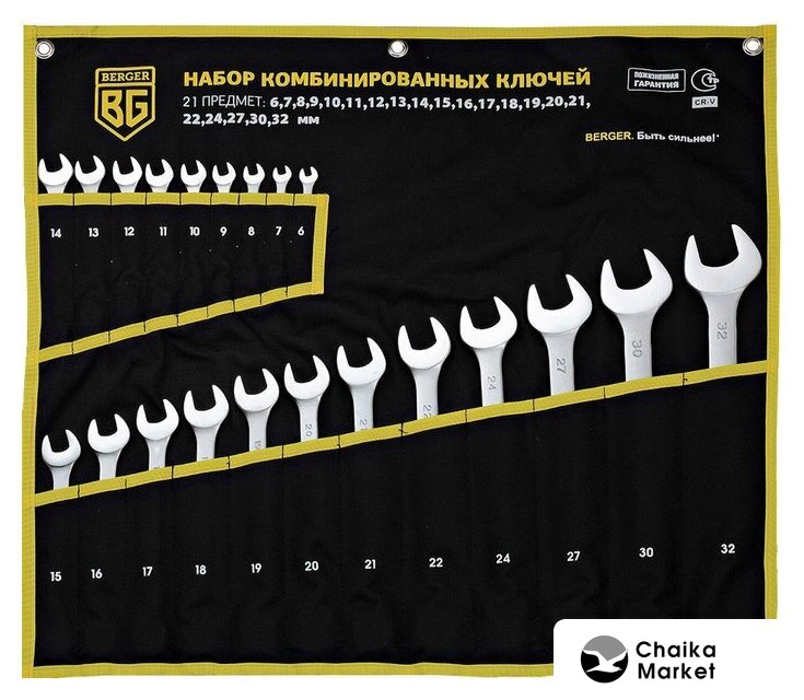 Комплектация | Ключи комбинированные: 6, 7, 8, 9, 10, 11, 12, 13, 14, 15, 16, 17, 18, 19, 20, 21, 22, 24, 27, 30, 32 мм |
