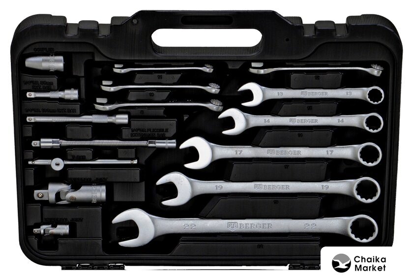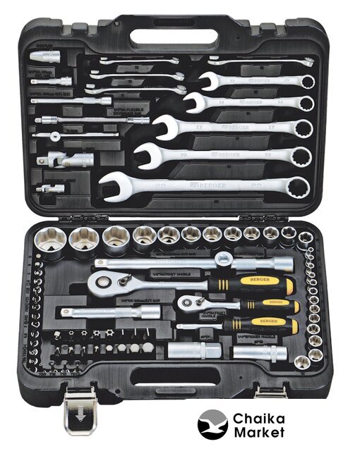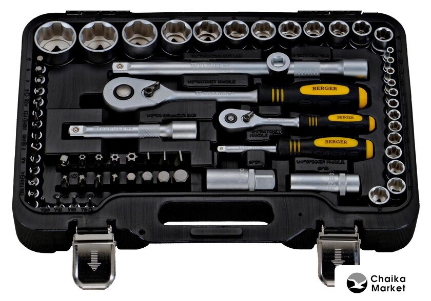 Комплектация | - 13 шт.: 1/4" Головки торцевые 6-гранные Super Lock: 4, 4.5, 5, 5.5, 6, 7, 8, 9, 10, 11, 12, 13, 14 мм- 1 шт.: 1/4" Трещотка (ключ трещоточный с быстрым сбросом): 45 зубов- 1 шт.: 1/4" Гибкий удлинитель: 150 мм- 2 шт.: 1/4" Удлинитель: 50, 100 мм- 1 шт.: 1/4" Отвертка с присоединительным квадратом- 1 шт.: 1/4" Кардан шарнирный- 1 шт.: 1/4" Вороток Т-образный: 110 мм- 17 шт.: 1/4" Биты-головки:Hex (шестигранник): 3,4,5,6,Slot: 4, 5.5, 7Ph (крест): 1, 2Pz (позидрайв): 1, 2Torx (звёздочка): T8, T10, T15, T20, T25, T30- 1 шт.: 1/4" Переходник для электроинструмента- 12 шт.: 1/2" Головки торцевые 6-гранные Super Lock: 13, 14, 15, 16, 17, 18, 19, 22, 24, 27, 30, 32 мм- 2 шт.: 1/2" Головки свечные магнитные: 16, 21 мм- 1 шт.: 1/4" Трещотка (ключ трещоточный с быстрым сбросом): 45 зубов- 2 шт.: 1/2" Удлинитель: 125, 250 мм- 1 шт.: 1/2" Кардан шарнирный- 1 шт.: 1/2" Переходник скользящий- 9 шт.: Ключи комбинированные: 8, 10, 11, 12, 13, 14, 17, 19, 22 мм- 15 шт.: 5/16" Биты:Hex (шестигранник): 8, 10, 12, 14Slot (шлиц): 8, 10, 12Ph (крест): 3, 4Pz (позидрайв): 3, 4Torx (звёздочка): T40, T45, T50, T55- 1 шт.: 5/16” Адаптер для бит |