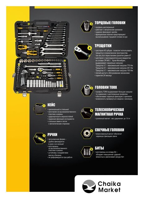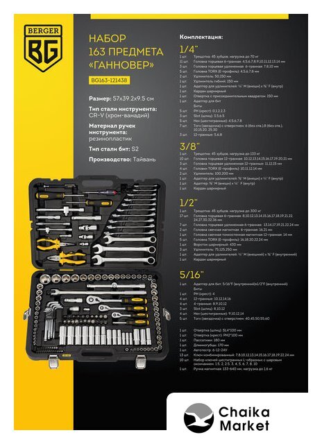 универсальный набор, 1/4", 3/8", 1/2", 174 предмета