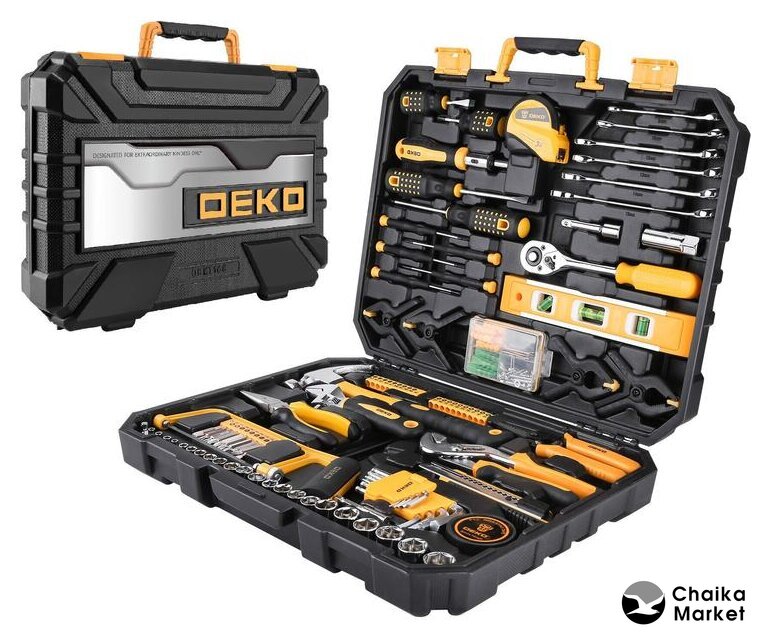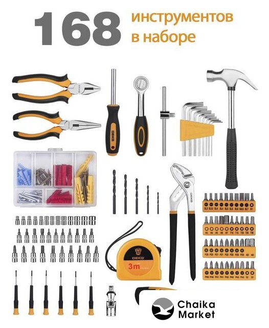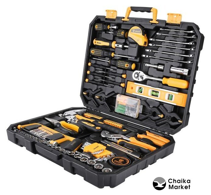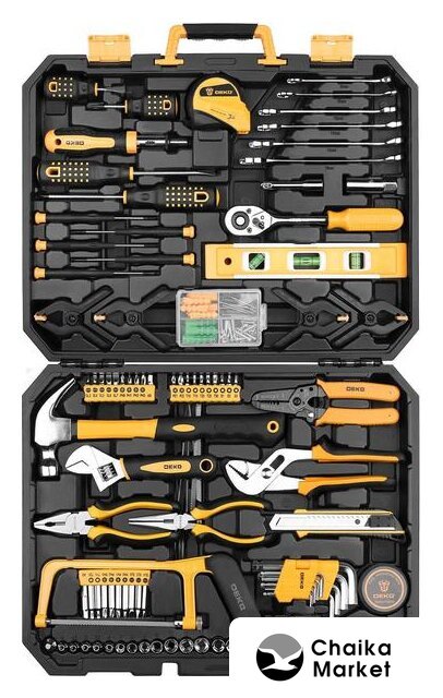 Комплектация | - Рулетка 3 м;- Отвертка для бит с трещоткой 6.35 мм;- Отвертки PH2Х38, 2Х100 мм., SL 6х38, 6х100 мм;- Отвертки точечные PH0, 00, 000; SL 2.4, 3 мм;- Зажим нейлоновый 3";- Комбинированные ключи 8, 10, 12, 13, 14, 15 мм;- Уровень 25 мм;- Трещотка 3/8";- Удлинитель торцевых головок 3/8"х3";- Головки свечные 3/8"х16 мм;- Головки 1/4": 4, 4.5, 5, 5.5, 6, 7, 8, 9, 10, 1, 12, 13 мм; 3/8": 10, 11, 12, 13, 14, 15, 16, 17, 18, 19 мм;- Переходник для головок торцевых: 1/4"х3/8";- Биты SL3, 4, 5, 6, 7; PH0, 1, 2, 3; PZ1, 2; Т10, 15, 20, 25, 30; S1, 2, 3; AD;- Биты 1/4" 15 мм: SL4, 5, 6; PH0, 1, 2, 3; T15, 20; AD;- Разводной ключ 8";- Разводной ключ 45 градусов 8";- Пассатижи 6";- Длинногубцы 6";- Молоток 0.2 кг;- Инструмент для зачистки проводов 7";- Пила 6";- Сменные полотна для пилы 2 шт;- Хомуты пластиковые 5 шт;- Ключи шестигранные: 1.5, 2, 2.5, 3, 4, 5, 6, 8, 10 мм;- Нож строительный 18 мм;- Изоляционная лента 5 м;- Шестигранный адаптер 60 мм;- Набор дюбелей и саморезов 71 шт. |