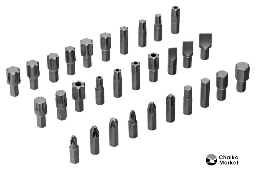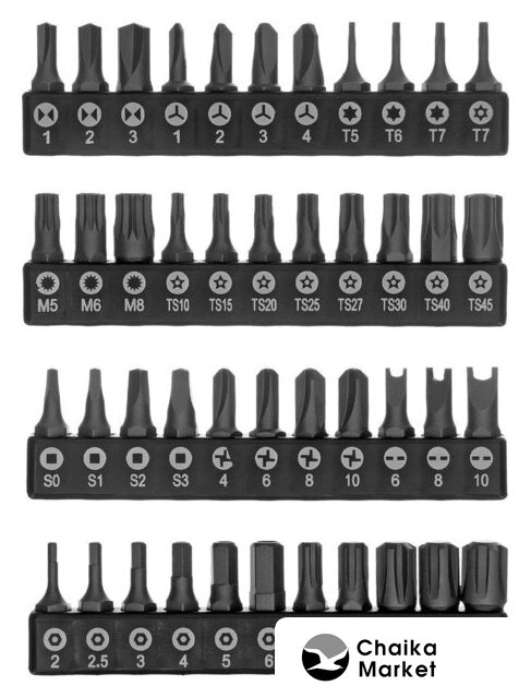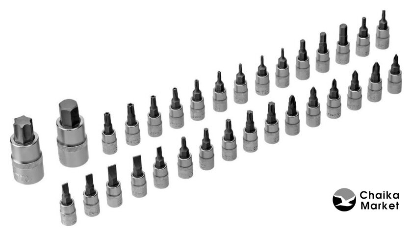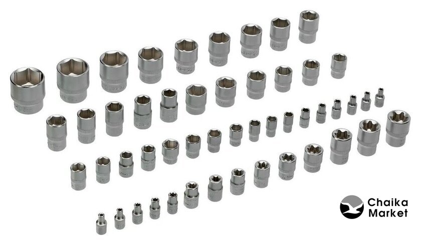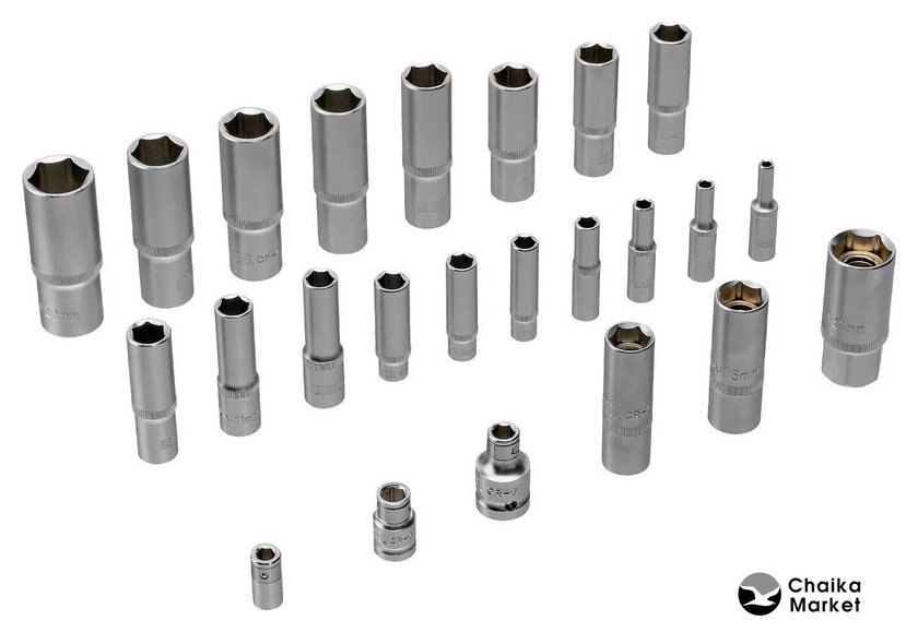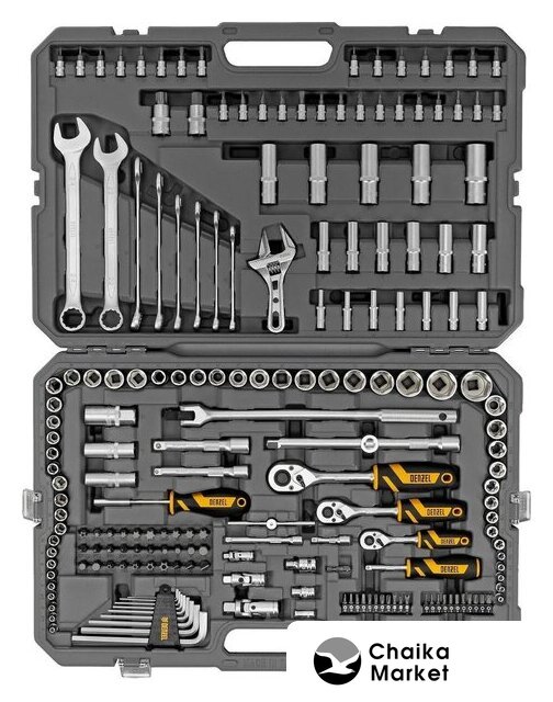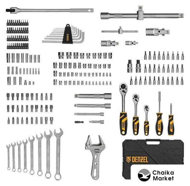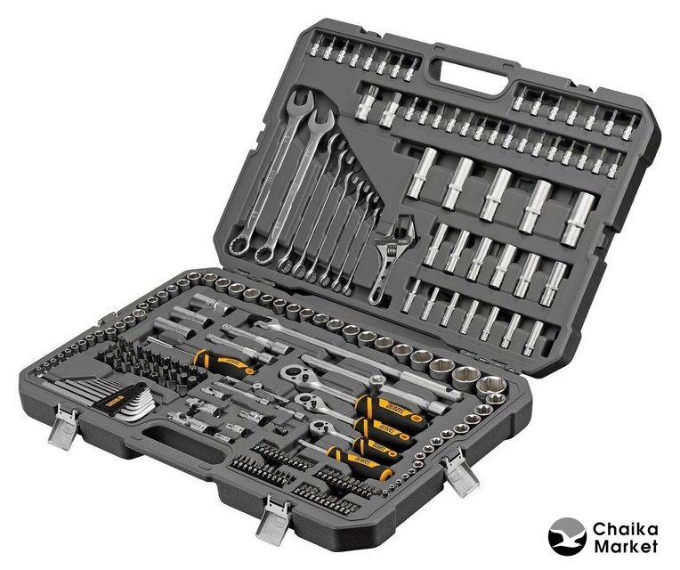 | Комплектация | Ключ-трещотка 1/4", 3/8", 1/2"3 штВороток шарнирный 1/2": 380 мм1 штВороток Т-образный 1/4": 115 мм1 штУдлинители 1/4": 50, 100 мм2 штУдлинитель 3/8": 125 мм1 штУдлинители 1/2": 125, 250 мм2 штПереходник для бит 1/4"-1/4"1 штПереходник для бит 3/8"-5/16"1 штПереходник для бит 1/2"-5/16"1 штКардан: 1/4", 3/8", 1/2"3 штКлюч разводной тонкие губки: 200 мм1 штОтвертка-держатель 2К-рукоятка 1/4": 150 мм1 штОтвертка для бит 2К-рукоятка 1/4": 200 мм1 штАдаптер с шестигранника на квадрат 1/4"-1/4"1 шт3-сторонний адаптер 3/8"-1/2"1 штГоловки торцевые 1/4"5 штГоловки торцевые 3/8"6 штГоловки торцевые 1/2"3 штГоловки торцевые удлиненные 1/4"7 штГоловки торцевые удлиненные 3/8"6 штГоловки торцевые удлиненные 1/25 штГоловки торцевые 1/4"13 штГоловки торцевые 3/8"10 штГоловки торцевые 1/2"14 штКлючи имбусовые9 штБиты с головками 1/2"12 штБиты-вставки 5/16", 30 мм30 штБиты-вставки 1/4", 25 мм44 шт |