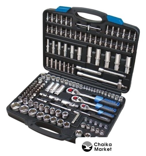 Комплектация | - Торцевые головки 1/2" 17 шт. (от 10 мм до 32 мм)- Торцевые головки 3/8" 10 шт. (от 10 мм до 19 мм)- Торцевые головки 1/4" 13 шт. (от 4 мм до 14 мм)- Глубокие торцевые головки 1/2" 5 шт. (16, 17, 18, 19, 22 мм)- Глубокие торцевые головки 3/8" 6 шт. (от 10 мм до 15 мм)- Глубокие торцевые головки 1/4" 7 шт. (от 4 мм до 10 мм)- Торцевые головки 1/2" Е-тип 2 шт. (20, 24 мм)- Торцевые головки 3/8" Е-тип 6 шт. (10, 11, 12, 14, 16, 18 мм)- Торцевые головки 1/4" Е-тип 5 шт. (4, 5, 6, 7, 8 мм)- Трещотка (1/2", 3/8", 1/4")- Кардан 1/2", 3/8", 1/4"- Удлинители 1/2" 2 шт. (125 мм, 250 мм)- Удлинители 3/8" 1 шт. (125 мм)- Удлинители 1/4" 2 шт. (50 мм, 100 мм)- Головки свечные 1/2" 2 шт. (16 мм, 21 мм)- Головки свечные 3/8" 1 шт. (18 мм)- Адаптер для вставок (бит) 1/2", 3/8", 1/4"- Переходник- Шестигранные ключи 10 шт. (1, 1.5, 2, 2.5, 3, 4, 5 мм)- Отвертка под биты 1/4"- Биты (насадки-отвертки) 24- Головки со вставкой 30 (1/4") |