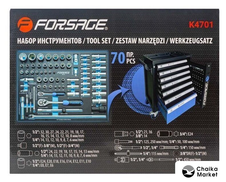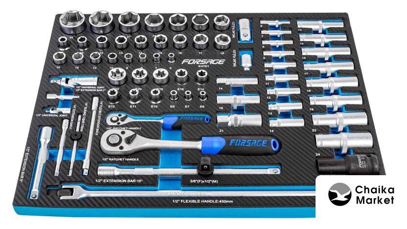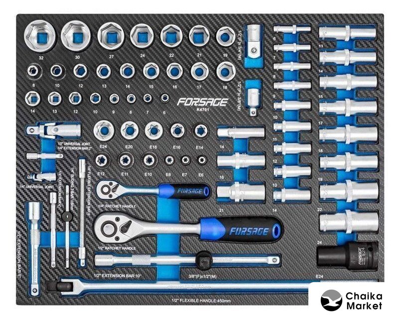 Комплектация | Оснасткаголовки (56 шт.), удлинители (4 шт.), кардан (2 шт.), переходник (2 шт.), адаптер (1 шт.)Головкиторцевые шестигранные (24 шт.), глубокие торцевые (17 шт.), торцевые Е-тип (12 шт.), свечные (3 шт.)Торцевые шестигранные головки1/2″ (8, 10, 12, 13, 14, 15, 16, 17, 18, 19, 21, 22, 24, 27, 30, 32 мм), 1/4″ (6, 7, 8, 9, 10, 12, 13, 14 мм)Глубокие торцевые головки1/2″ (13, 14, 15, 17, 18, 19, 22, 24 мм), 1/4″ (6, 7, 8, 9, 10, 11, 12, 13, 14 мм)Торцевые головки E-тип1/2″ (Е10, Е11, Е12, Е14, Е16, Е18, Е20, Е24), 1/4″ (Е6, Е7, Е8), 3/4″ (Е24)Удлинители1/2″ (125, 250 мм), 1/4″ (50, 100 мм)Кардан1/2″, 1/4″Ключивороток (2 шт.)ВороткиT-образный (1 шт.), шарнирный (1 шт.) |