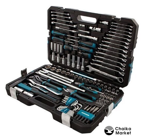 Комплектация | Инструменты в наборе трещотка (2 шт.), отвертка (6 шт.), клещи (1 шт.), плоскогубцы (1 шт.), молоток (1 шт.), выколотка (1 шт.), зубило (1 шт.), бокорезы (1 шт.), ключ гаечный (38 шт.)Трещотка 1/2″, 1/4″Отвертки шлицевая (SL) (3 шт.), крестовая (PH) (3 шт.)Доп. комплектация кернер (1 шт.), кейс (пластиковый), бородок (1 шт.), крейцмейстер (1 шт.)ОснасткаОснастка головки, удлинители (5 шт.), кардан (2 шт.)Головки торцевые шестигранные (30 шт.), свечные (2 шт.), головки со вставкой (14 шт.), удлиненные шестигранные (8 шт.)Торцевые шестигранные головки 1/2″ (8, 9, 10, 11, 12, 13, 14, 15, 16, 17, 18-22, 24, 27, 30, 32 мм), 1/4″ (4, 4.5, 5, 5.5, 6, 7, 8, 9, 10, 11, 12, 13 мм)Головки со вставкой шестигранные (Hex) (Н4, Н5, Н6, Н7, Н8, Н10, Н12, Н14, Н17), звездочкой (Torx) (Т10, Т15, Т20, Т25, Т27)Удлинители 1/2″ (125, 250 мм), 1/4″ (75 мм), гибкий удлинитель (1/4")Кардан 1/2″ (12.7 мм), 1/4″ (6.35 мм)КлючиКлючи вороток (4 шт.), комбинированный (14 шт.), разрезной (4 шт.), имбусовый (16 шт.)Воротки T-образныйРазмер ключа 8 мм, 10 мм, 11 мм, 12 мм, 13 мм, 14 мм, 15 мм, 17 мм, 16 мм, 19 мм, 1.5 мм, 2 мм, 2.5 мм, 3 мм, 4 мм, 5 мм, 6 мм, 21 мм |