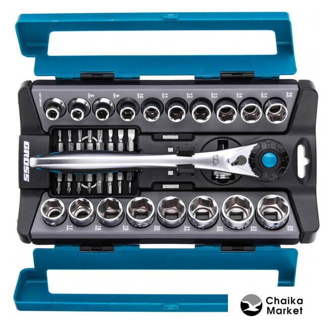 Комплектация | Ключ трещоточный 1/2"Переходник 1/2" – 1/4"Адаптер для бит 5/16" - 1/2"Головки торцевые 1/2": 8, 9,10, 11, 12, 13, 14, 15, 16, 17, 18, 19, 20, 21, 22, 23, 24 ммБиты 5/16": PH1, PH2, PZ1, PZ2, SL4, SL5.5, SL7, H3, H4, H5, H6, T10, Т15, Т20, Т25, Т30.Панель.Упаковка. |