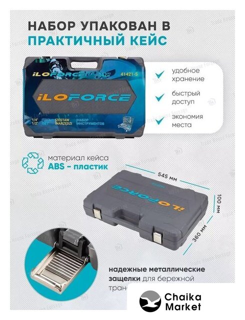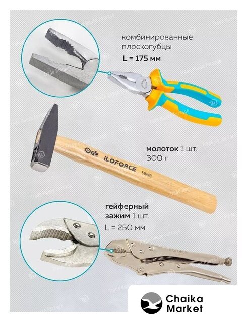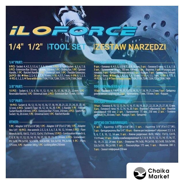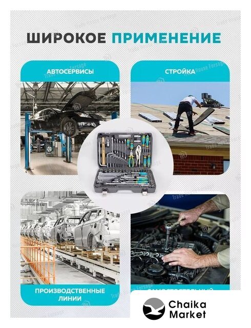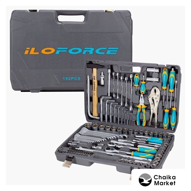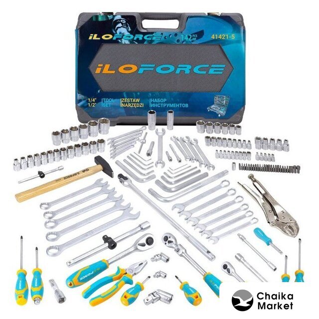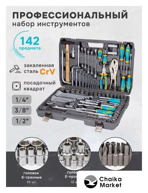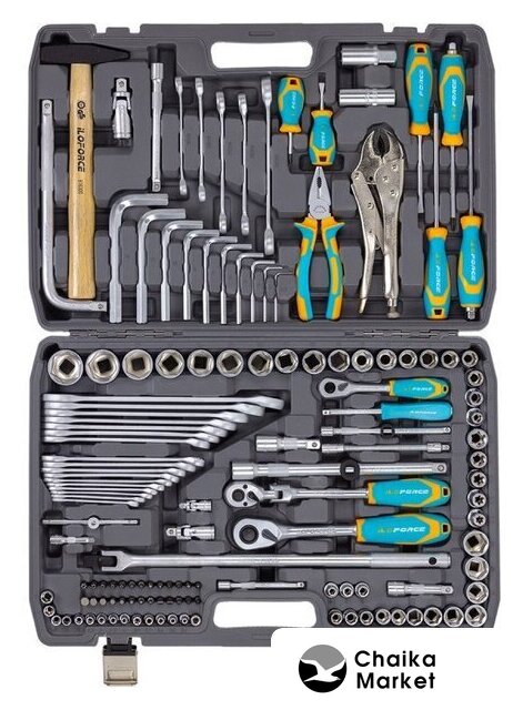 Комплектация | трещотка (3 шт.), отвертка (6 шт.), плоскогубцы (1 шт.), молоток (1 шт.), ключ гаечный (35 шт.), головки (55 шт.), насадки-биты (26 шт.), удлинители (8 шт.), кардан (3 шт.), держатель (1 шт.), адаптер (2 шт.), кейс (пластиковый) |
