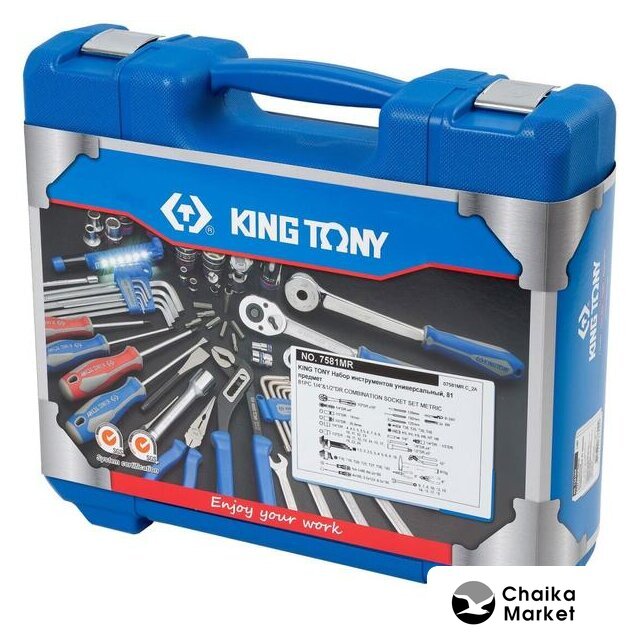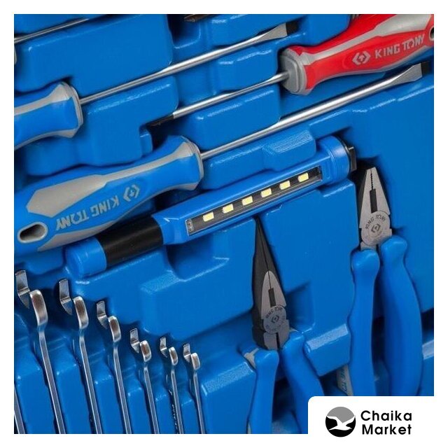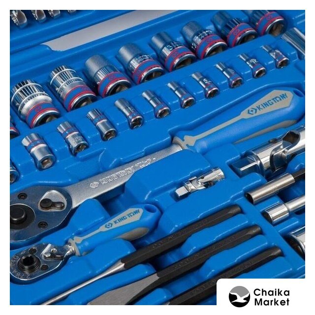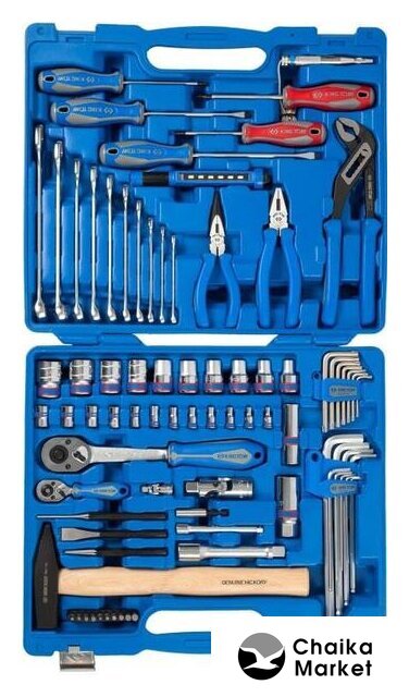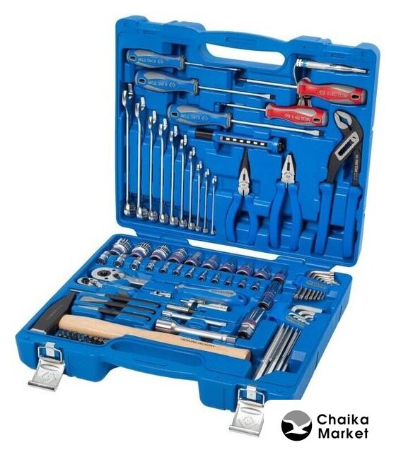 Комплектация | Головки и принадлежности 1/2"Головка торцевая стандартная 6-гранная: 10, 11, 12, 13, 14, 15, 17, 19, 22, 24 ммГоловка свечная 6-гранная, резиновый фиксатор: 16 ммГоловка свечная 6-гранная, резиновый фиксатор: 21 ммТрещотка флажковая с кнопкой: 32 зубца, 250 ммУдлинитель: 125 ммКардан: 1 шт.Головки и принадлежности 1/4"Головка торцевая стандартная 6-гранная: 4, 4.5, 5, 5.5, 6, 7, 8, 9, 10, 11, 12, 13 ммТрещотка флажковая, для головок и вставок (бит): 72 зубца, 108 ммУдлинитель: 100 ммДержатель вставок (бит) 1/4", магнитный, для шуруповёрта: 1 шт.Кардан: 1 шт.КлючиКлюч комбинированный: 6, 7, 8, 10, 12, 13, 14, 15, 17, 19 ммОтвёртки и шестигранники- Крестовые Phillips: PH1 x 80 мм, PH2 x 100 мм- Шлицевые Slotted: 4 x 100 мм, 5.5 x 100 мм- Набор шестигранников Г-образных: 1.5, 2, 2.5, 3, 4, 5, 6, 8, 10 мм- Набор Г-образных TORX: T10H, T15H, T20H, T25H, T27H, T30H, T40HВставки (биты) 1/4" (6.35 мм)- Шестигранные HEX: H3, H4, H5, H6, H7, H8- 6-лучевая звезда TORX: T20, T25, T30, T40Шарнирно-губцевый инструментПлоскогубцы комбинированные: 160 ммПлоскогубцы тонконосые: 160 ммЗахват переставной: 250 ммУдарный и режущий инструментВыколотка: 4х150 ммЗубило: 15x125 ммКернер: 4х120 ммВспомогательный инструментФонарь LEDPen, 6 элементов, 3W, 135 люмен (lm), ААА, ABS пластик: 1 шт.Тестер для проверки напряжения 6~24В, игла, световая индикация, бронзовый корпус: 1 шт.Молоток 500 гр., немецкий тип: 1 шт. |