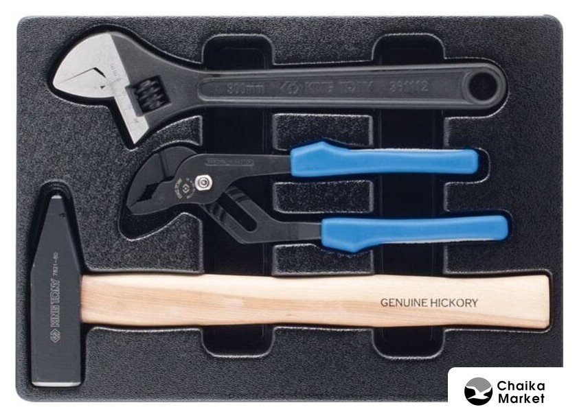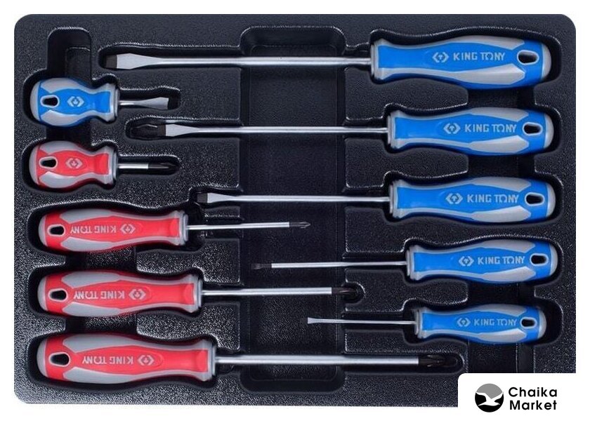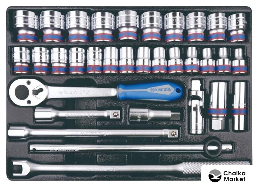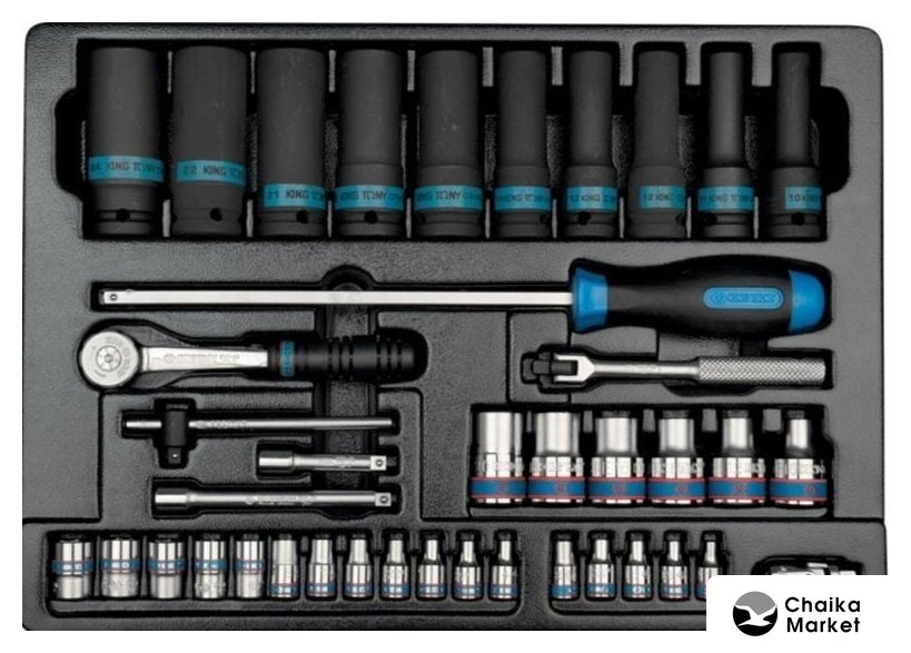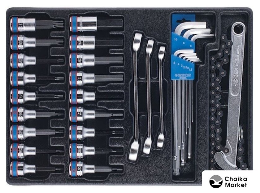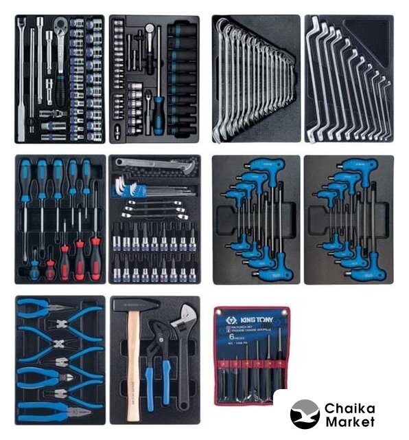 Комплектация | • Головки торцевые стандартные шестигранные 1/2": 8, 9, 10, 11, 12, 13, 14, 15, 16, 17, 18, 19, 20, 21, 22, 23, 24, 25, 26, 27, 28, 29, 30, 32 мм;• Головка свечная шестигранная 1/2", 21 мм, L = 70 мм;• Головка свечная шестигранная 1/2", 16 мм, L = 70 мм;• Кардан 1/2;• Удлинитель 1/2", 75 мм;• Удлинитель 1/2", 125 мм;• Удлинитель 1/2", 250 мм;• Трещотка 1/2", 250 мм, 32 зубца, флажковая, фиксатор;• Вороток 1/2", 380 мм, с шарниром;• Вороток 1/2", 300 мм, скользящий.• Головки торцевые ударные глубокие шестигранные 1/2": 10, 11, 12, 13, 14, 17, 19, 21, 22, 24;• Головки торцевые TORX Е-стандарт 1/2", L = 37 мм: E10, E12, E14, E16, E18, E20;• Головки торцевые TORX Е-стандарт 1/4", L = 24 мм: E4, E5, E6, E7, E8;• Головки торцевые стандартные шестигранные 1/4": 4, 4.5, 5, 5.5, 6, 7, 8, 9, 10, 11, 12, 13;• Отвертка вороток 1/4", 310 мм, двухкомпонентная ручка;• Трещотка 1/4", 140 мм, 72 зубца, дисковый механизм;• Вороток 1/4", 125 мм, с шарниром;• Вороток 1/4", 115 мм, скользящий;• Удлинитель 1/4", 50 мм;• Удлинитель 1/4", 100 мм;• Кардан 1/4".• Ключи комбинированные, Размеры: 8, 10, 11, 12, 13, 14, 15, 17, 18, 19, 21, 22 24, 27, 30, 32• Ключи накидные: Размеры: 6x7, 8x9, 10x11, 12x13, 14x15, 16x17, 18x19, 20x22, 21x23, 24x27, 30x32• Отвертки крестовые Phillips: Размеры: NO.1x80, NO.2x38, NO.2x100, NO.3x150• Отвертки шлицевые Slotted: Размеры: 3x75, 4x100, 5.5x125, 6.5x38, 6.5x150, 8x175• Насадки (биты) торцевые 1/2", TORX, L=80 мм KING TONY (4033)Размеры: T20, T25, T27, T30, T40, T45, T50, T55, T60• Насадки (биты) торцевые 1/2", HEX, L=80 мм: Размеры: 4, 5, 6, 7, 8, 10, 12, 14, 17• Шестигранники Г-образные, с шаровым окончанием: Размеры: 1.5, 2, 2.5, 3, 4, 5, 6, 8, 10• Ключи разрезные: Размеры: 10x11, 12x14, 14x17• Съемник масляных фильтров, 60-140 мм, цепной.• Ключи L-образные HEX: Размеры: 2, 2.5, 3, 4, 5, 6, 8, 10• Ключи L-образные TORX: Размеры: T10, T15, T20, T25, T30, T40, T45, T50• Плоскогубцы комбинированные серии 6111-08 - 200 мм;• Бокорезы серии 6211-06 - 160 мм;• Плоскогубцы тонконосые серии 6311-06 - 160 мм;• Съемник для стопорных колец, прямые, сжатие: 180 мм;• Съемник для стопорных колец, загнутые, сжатие: 180 мм;• Съемник для стопорных колец, прямые, разжатие: 180 мм;• Съемник для стопорных колец, загнутые, разжатие: 180 мм.• Ключ разводной Chrome: 300 мм;• Захват переставной: 250 мм;• Молоток квадратный: 800 гр.• Выколотки: Размеры: 2x30, 3x40, 4x50, 5x50, 6x50, 8x50 |