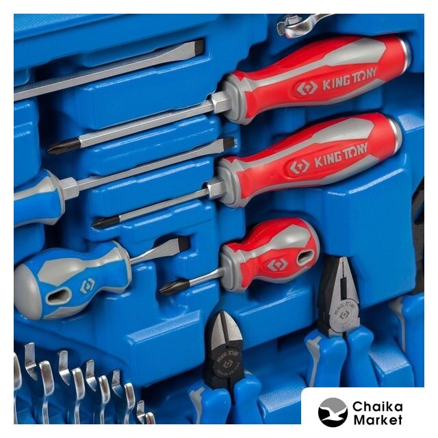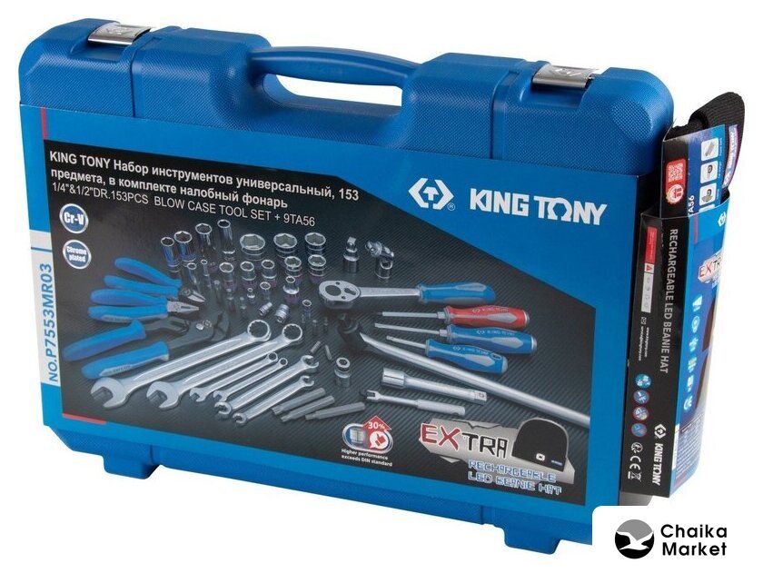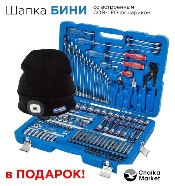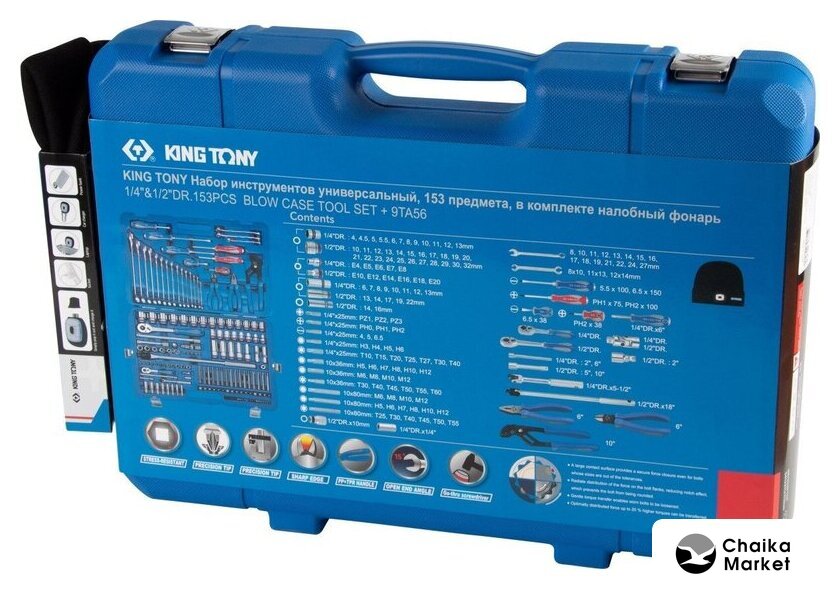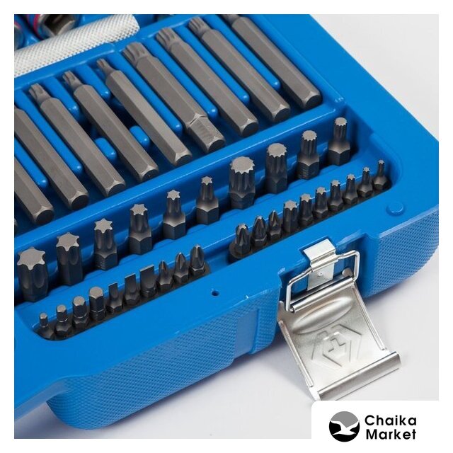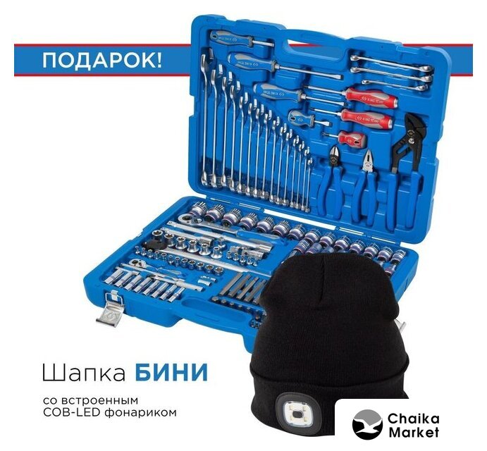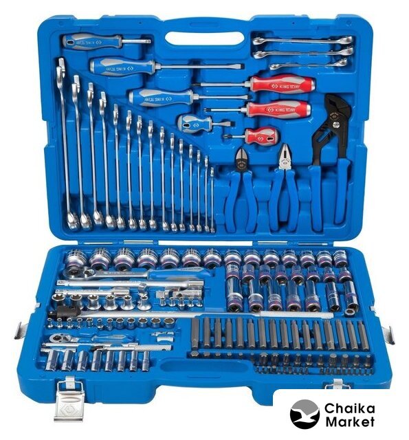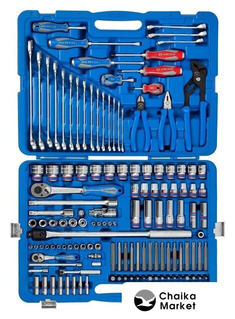 | Комплектация | 1/2" и 1/4" головки и принадлежности, вставки (биты), ключи, отвертки, шарнирно-губцевый инструмент, кейс |