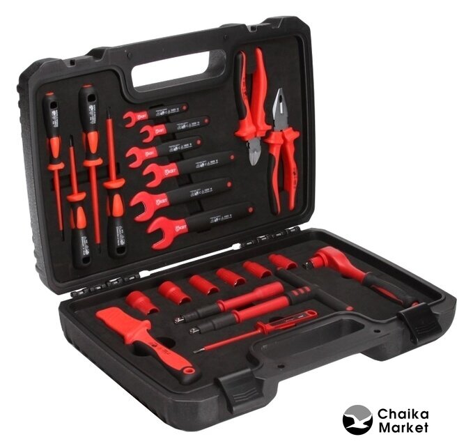Комплектация | - диэлектр. трещоточный ключ 200 мм- диэлектр. Т-образная рукоятка 200 мм- диэлектр. удлинитель 150 мм- диэлектр. шестигранная головка 3/8’’ – 8 мм- диэлектр. шестигранная головка 3/8’’ – 10 мм- диэлектр. шестигранная головка 3/8’’ – 12 мм- диэлектр. шестигранная головка 3/8’’ – 13 мм- диэлектр. шестигранная головка 3/8’’ – 17 мм- диэлектр. шестигранная головка 3/8’’ – 19 мм- диэлектр. однорожковый ключ 8 мм- диэлектр. однорожковый ключ 10 мм- диэлектр. однорожковый ключ 12 мм- диэлектр. однорожковый ключ 13 мм- диэлектр. однорожковый ключ 17 мм- диэлектр. однорожковый ключ 19 мм- диэлектр. нож монтерский НМИ-05- диэлектр. пассатижи 180 мм- диэлектр. бокорезы 160 мм- диэлектр. отвертка: шлиц 4х100- диэлектр. отвертка: шлиц 5.5х125- диэлектр. отвертка: PH1x80- диэлектр. отвертка: PH2x100- отвертка-индикатор |