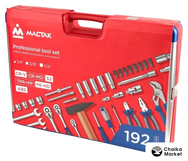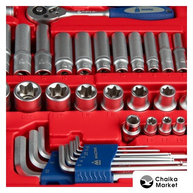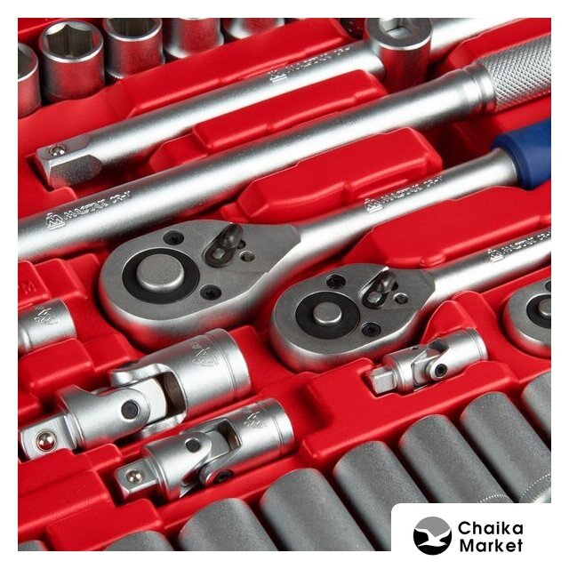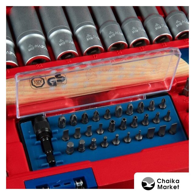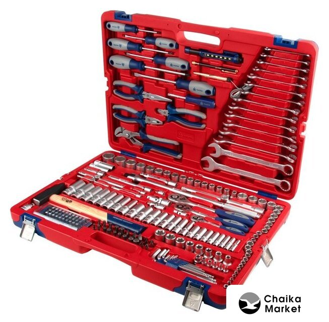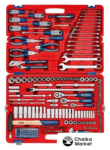 | Комплектация | Головки и принадлежности 1/2", 3/8", 1/4"; Вставки (биты) 5/16", 1/4"; Ключи; Отвёртки; Шарнирно-губцевый инструмент; Вспомогательный инструмент; Кейс |