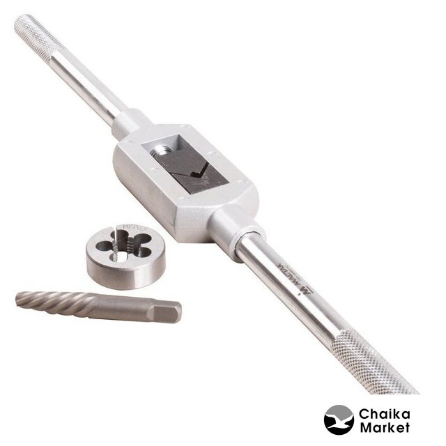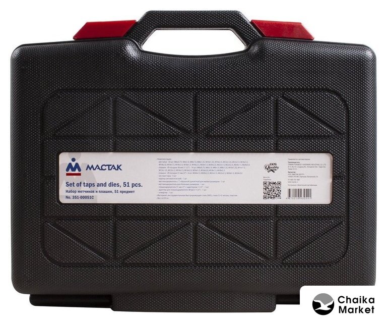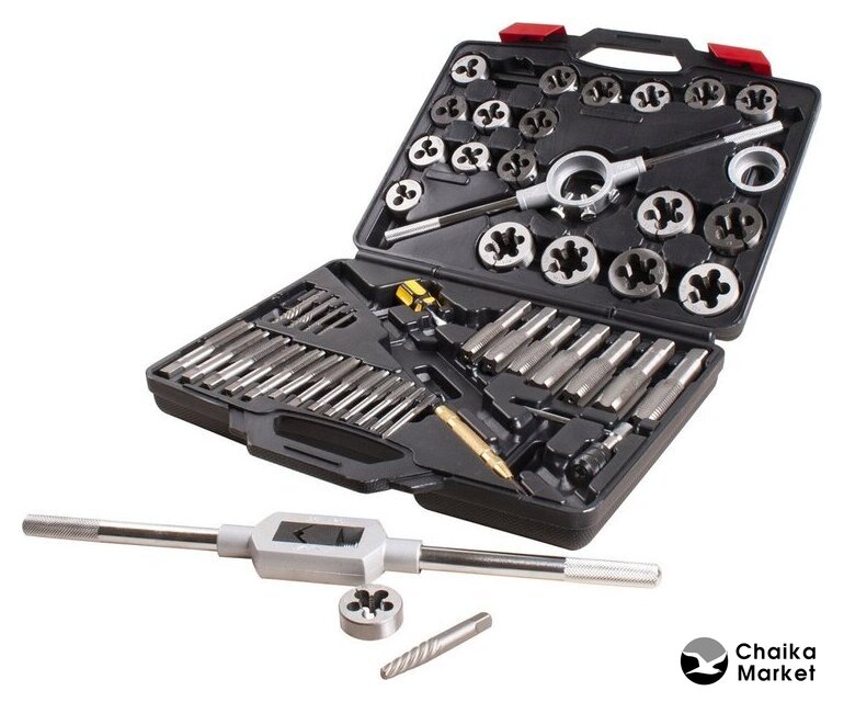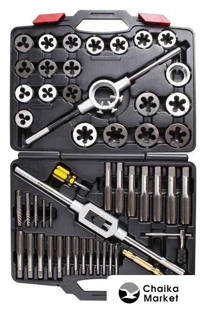| Комплектация | Метчики - 20 шт; Плашки Ø посадки 38 мм - 14 шт; Плашки Ø посадки 51 мм - 6 шт; Экстракторы - 5 шт; Кернер автоматический - 1 шт; Метчикодержатель с Т-образной рукояткой для малых размеров - 1 шт; Метчикодержатель для больших размеров - 1 шт; Плашкодержатель 51 мм с адаптером 1-1/2" - 1 шт; Адаптер для плашкодержателя 38 мм - 1 шт; Отвертка - 1 шт. |