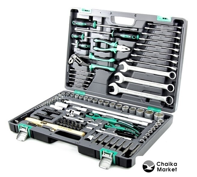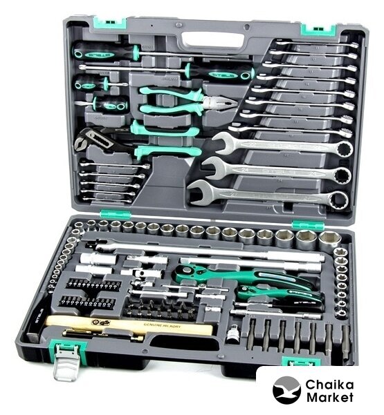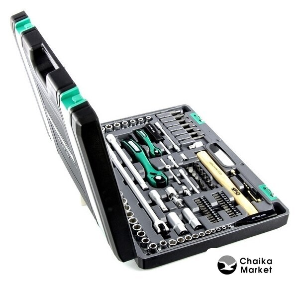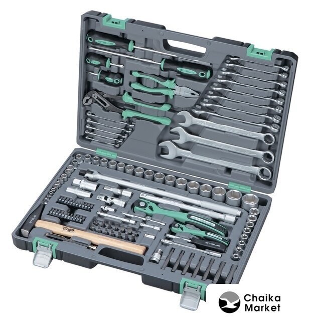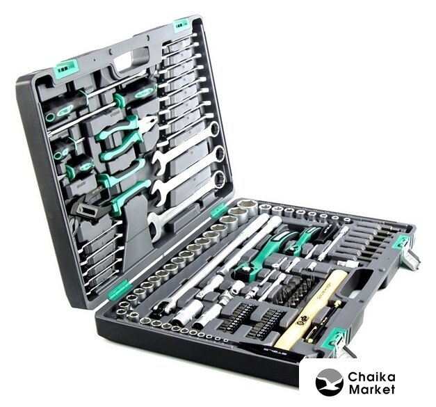 Комплектация | - Ключ трещоточный 1/4.- Ключ трещоточный 1/2.- Головки торцевые 1/2: 10, 11, 12, 13, 14, 15, 16, 17, 18, 19, 20, 21, 22, 23, 24, 27, 30, 32, Е10, Е11, Е12, Е14, Е16, Е18, Е20, Е22.- Головки свечные 1/2: 21 мм и 16 мм.- Удлинители 1/2 250 мм, под ключ и 75 мм, под ключ.- Удлинители 1/4 100 мм под ключ и 50 мм под ключ.- Удлинитель гибкий 1/4: 145 мм, под ключ.- Головки торцевые 1/4: 4, 5, 6, 7, 8, 9, 10, 11, 12, 13.- Вороток г-образный.- Вороток на 1/4.- Биты, 8 мм диаметр, длина 30 мм PH1, PH2, PH3 SL4, SL5.5, SL7 T10, T20, T25, T27, T30, T40, T45, T50.- Биты 1/4 ” диаметра, длина 25 мм Т10, Т15, Т20, Т25, Т27, Т30, Н3, Н4, Н5, Н6, Н7, SL3, SL4, SL5.5, SL7, PZ1, PZ2, PZ3, PH0, PH1, PH2, PH3.- Биты удлиненные, длина 75 мм, диаметр 8 мм.- Переходник с 1/2 квадрат на шестигранник диаметром 8 мм H4, H5, H6, H7, H8, H10, H12- Молоток, с квадратным бойком, 300 гр.- Отвертка держатель 1/4.- Пассатижи.- Клещи переставные.- Отвертки SL8 x 200 мм, PH3 x 200 мм.- Отвертки SL6.5 x 38 мм, PH2 x 38 мм.- Ключи комбинированные 6, 7, 8, 9, 10, 11, 12, 13, 14, 15, 16, 17, 19, 22, 24, 27.- Ручка телескопическая – магнит, длина 15 мм, выдвигается на 54 мм, диаметр наконечника 11 мм.- Кардан на 1/2 и 1/4. |