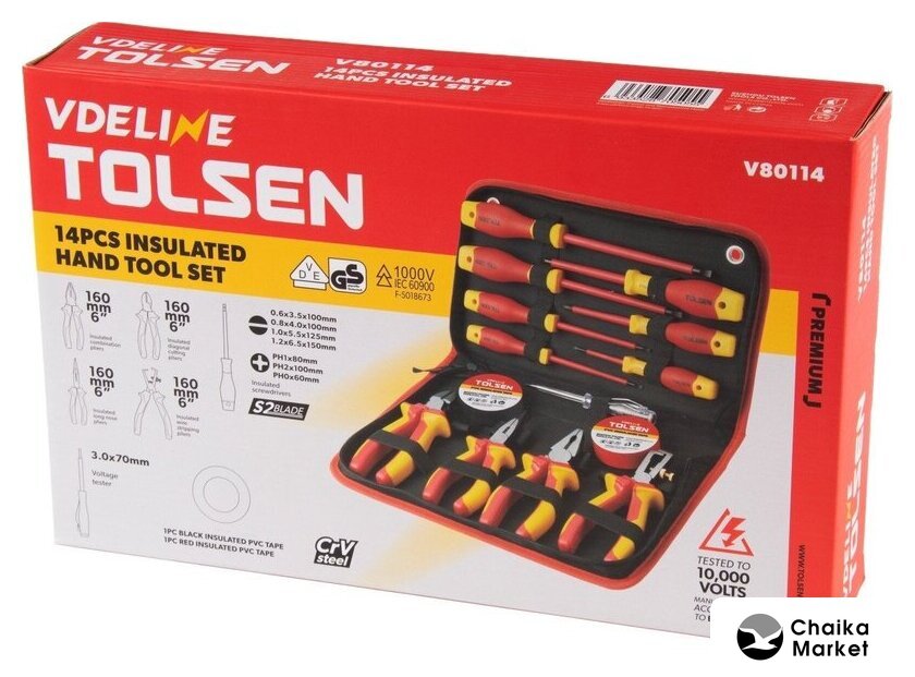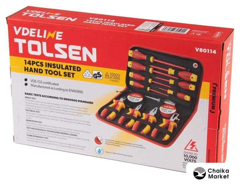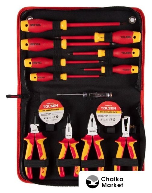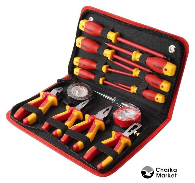 | Комплектация | Отвёртки диэлектрические, шарнирно-губцевый инструмент диэлектрический, тестер-отвёртка для проверки напряжения, изоляционная лента PVC |