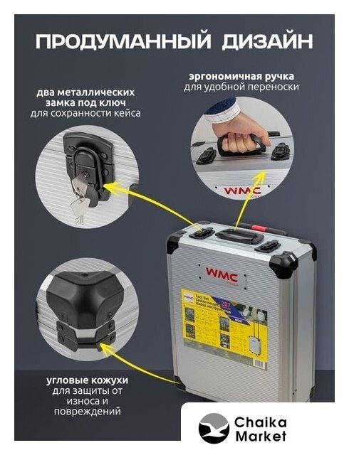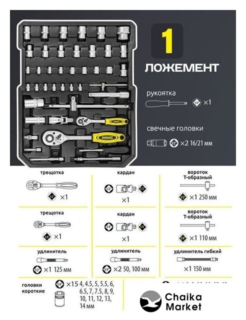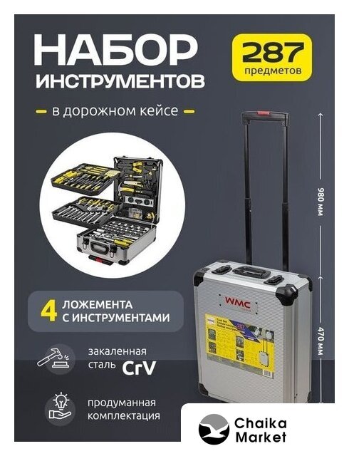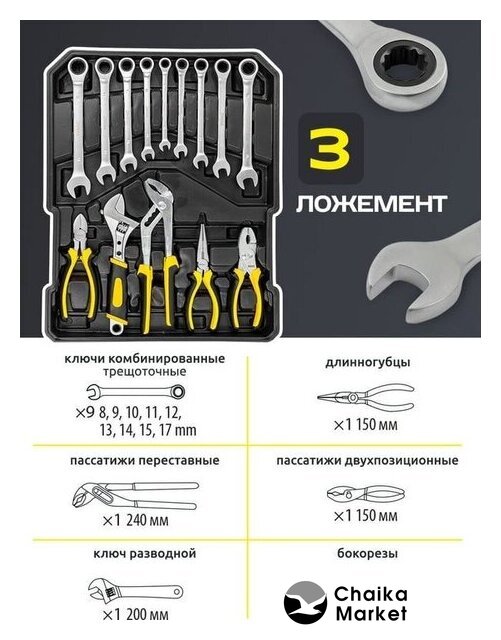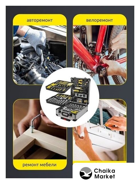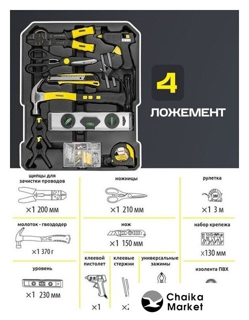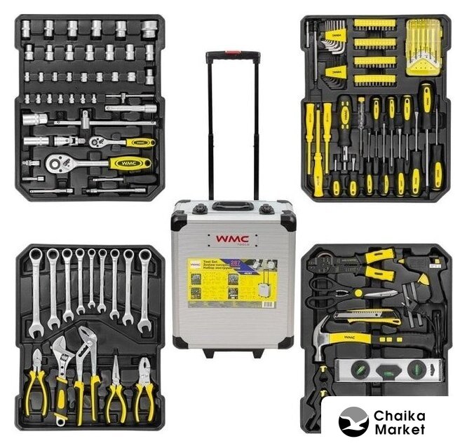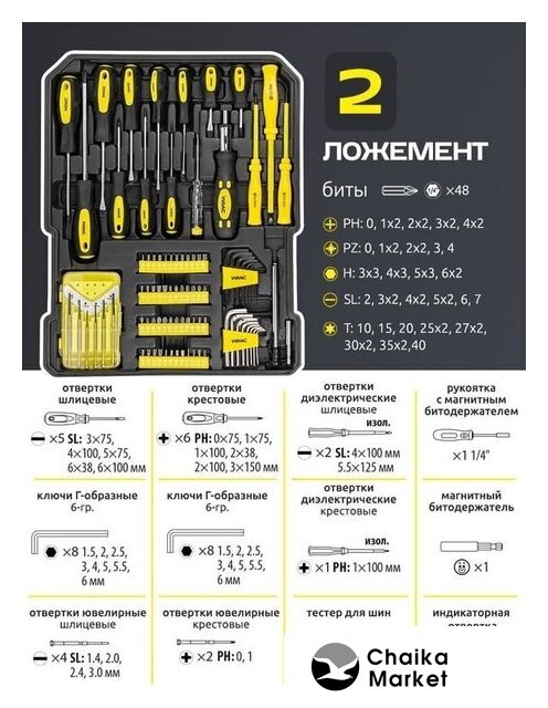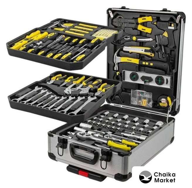 | Комплектация | - Свечные головки 16 и 21 мм- Трещотки 1/4" и 1/2"- Карданы 1/4" и 1/2"- Т-образный вороток 1/4" 110 мм- Т-образный вороток 1/2" 250 мм- Рукоятка 1/4"- Удлинитель 1/2" 125 мм- Удлинители 1/4" 50 и 100 мм- Гибкий удлинитель 150 мм- Головки торцевые 1/4" 4, 4.5, 5, 5.5, 6, 6.5, 7, 7.5, 8, 9, 10, 11, 12, 13, 14 мм- Головки торцевые 1/2" 8, 9, 10, 11, 12, 13, 14, 15, 16, 17, 18, 19, 20, 30 мм- Отвертки SL3x75, SL4x100, SL5x75, SL6x38, SL6x100, РН0х75, РН1х75, РН1х100, РН2х38, РН2х100, РН3х150- Отвертки изолированные SL4х100, SL5.5х125- Рукоятка с магнитным битодержателем 1/4"- Г-образные шестигранные ключи 1.5, 2, 2.5, 3, 4, 5, 5.5, 6 мм- Отвертки диэлектрические РН1х100 мм- Магнитный битодержатель- Отвертки ювелирные SL1.4, 2.0, 2.4, 3.0 мм- Отвертки ювелирные РН0, РН1- Тестер для шин- Индикаторная отвертка 100-250 В- Комбинированные ключи 8, 9, 10, 11, 12, 13, 14, 15, 17 мм- Длинногубцы 150 мм- Клещи переставные 240 мм- Пассатижи двухпозиционные 150 мм- Ключ разводной 200 мм- Бокорезы 150 мм- Щипцы для зачистки проводов 200 мм- Ножницы 210 мм- Рулетка 3 м- Молоток-гвоздодер 370 г- Нож канцелярский 150 мм- Набор крепежа (130 предметов)- Уровень 230 мм- Изолента 8 м- Клеевой пистолет- Клеевые стержни 2 шт.- Струбцины пружинные 2 шт.- Кейс |