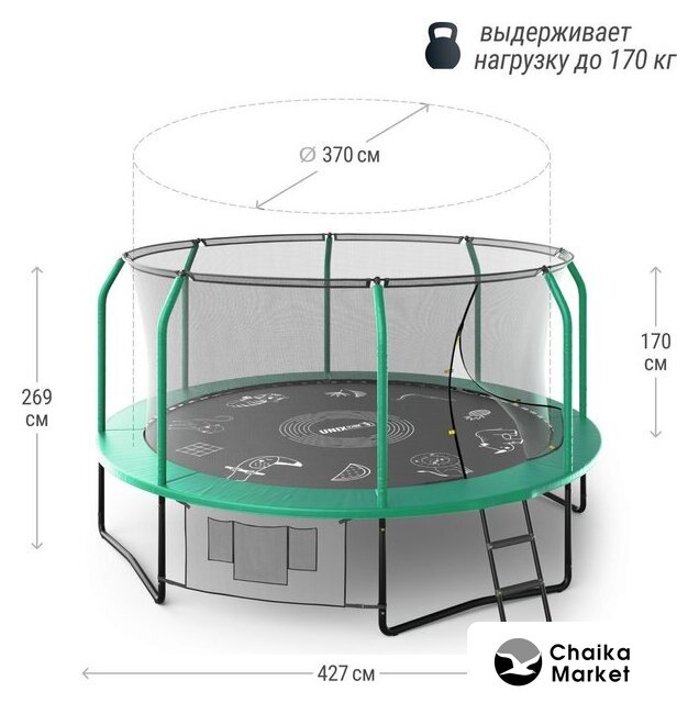 пружинный (каркасный) круглый, диаметр (диагональ): 427 см, нагрузка: 150 кг, с сеткой, с лестницей