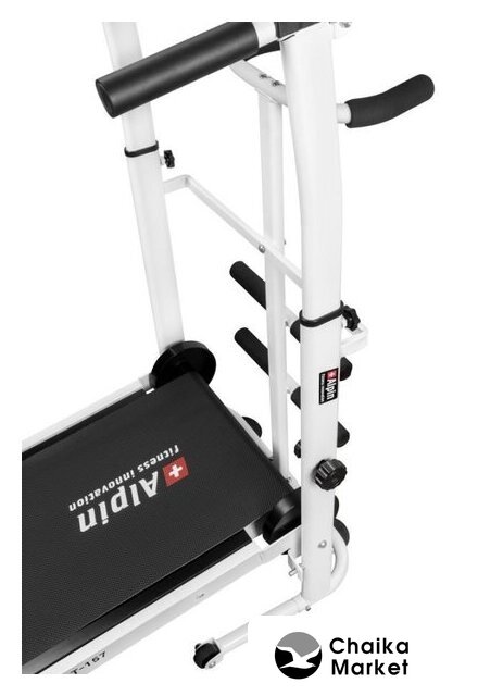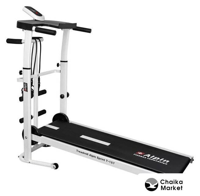 | Особенности | Многофункциональная малогабаритная беговая дорожка ALPIN Sprint T-157 это не только беговая дорожка, но и “диск здоровья”, который позволит сформировать изящную талию, эспандеры, которые позволят подтянуть мышцы рук и плечи. Так же на дорожке есть упоры для ног, которые позволят делать упражнения на пресс. |