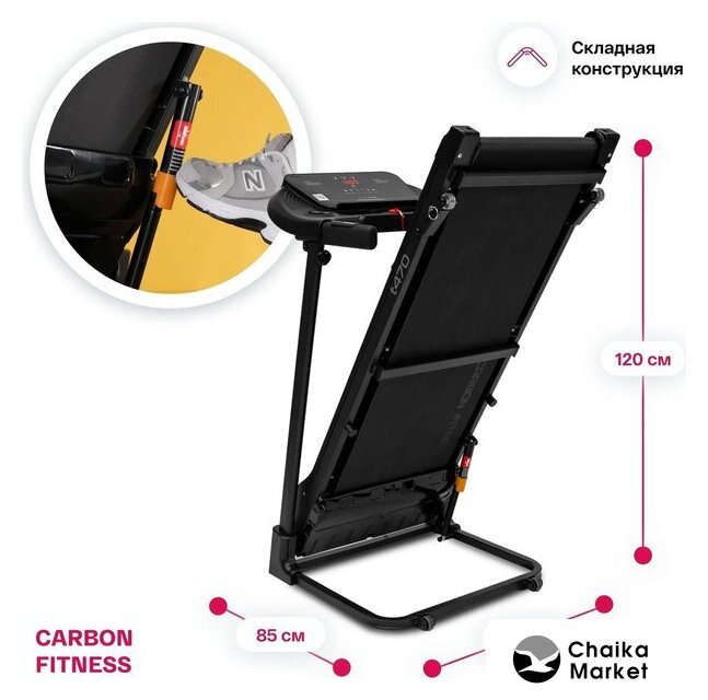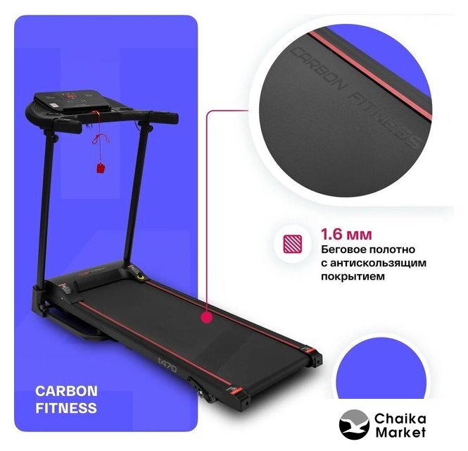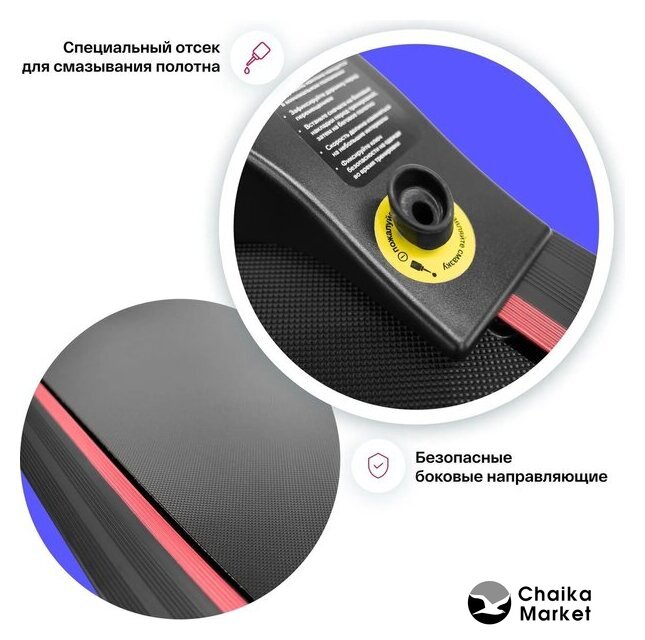 Особенности | кнопки управления на поручнях, наличие ключа безопасности, система легкой ручной смазки бегового полотна и легкого складывания дорожки, отсеки для аксессуаров |