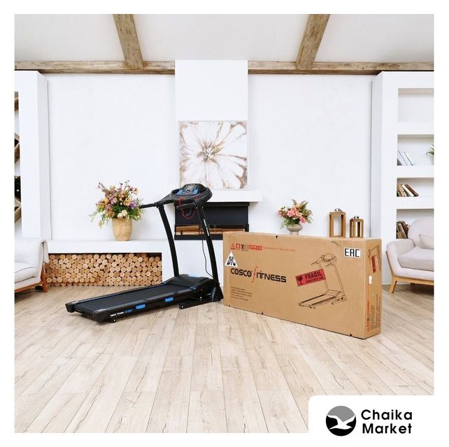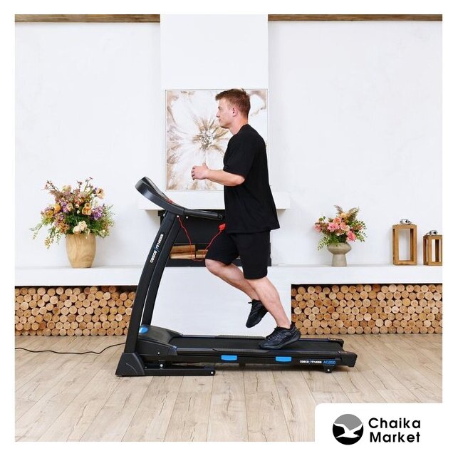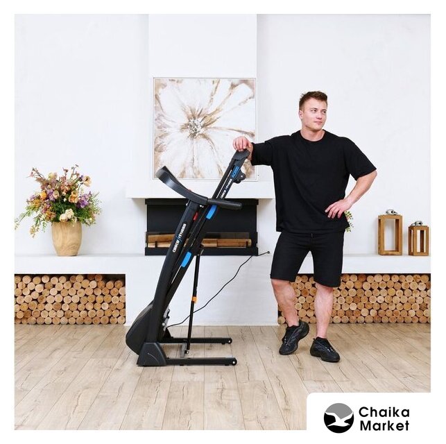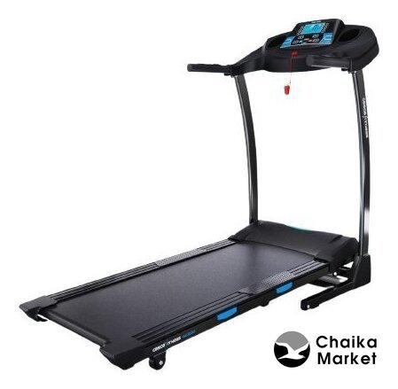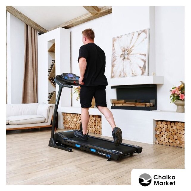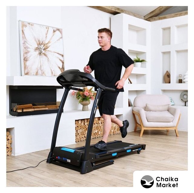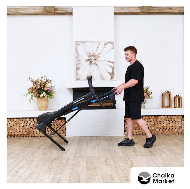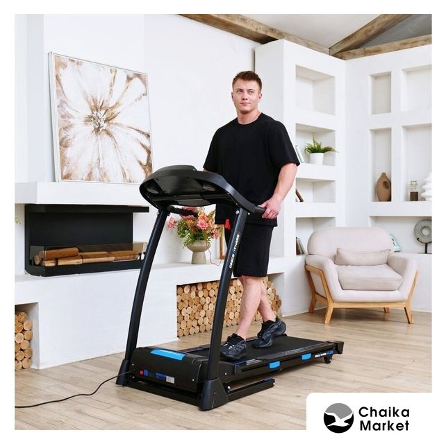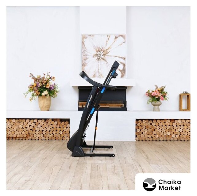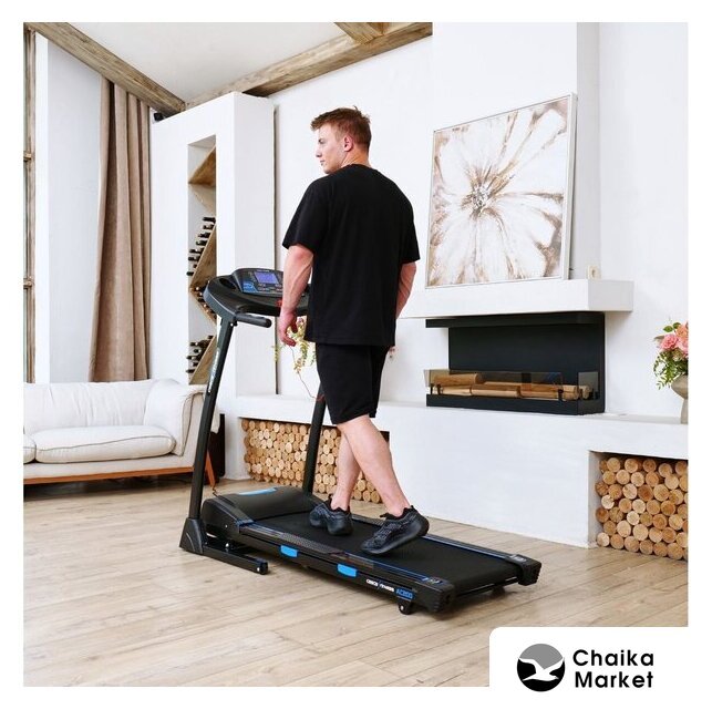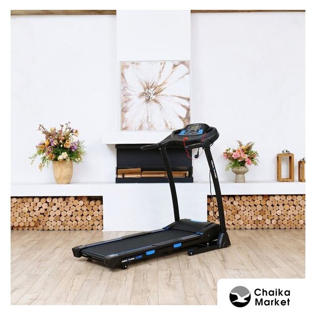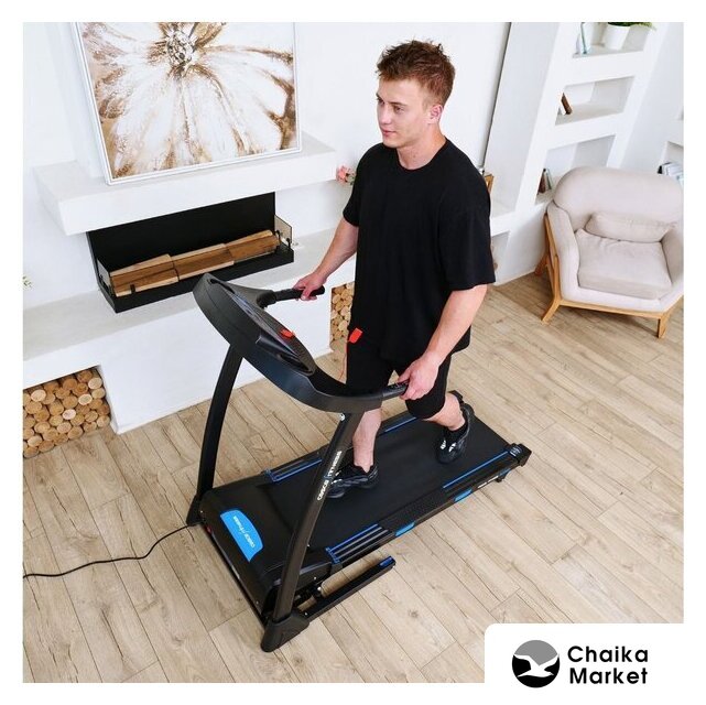 электрическая беговая дорожка, ручная ступенчатая регулировка угла наклона, полотно: 40×110 см, скорость движения: 0.5–12 км/ч, 12 программ тренировок