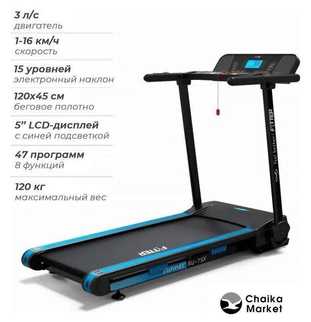 электрическая беговая дорожка, ручная ступенчатая регулировка угла наклона, полотно: 42×120 см, скорость движения: 1–14 км/ч, 12 программ тренировок