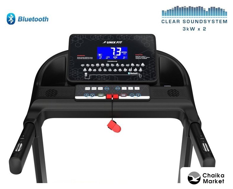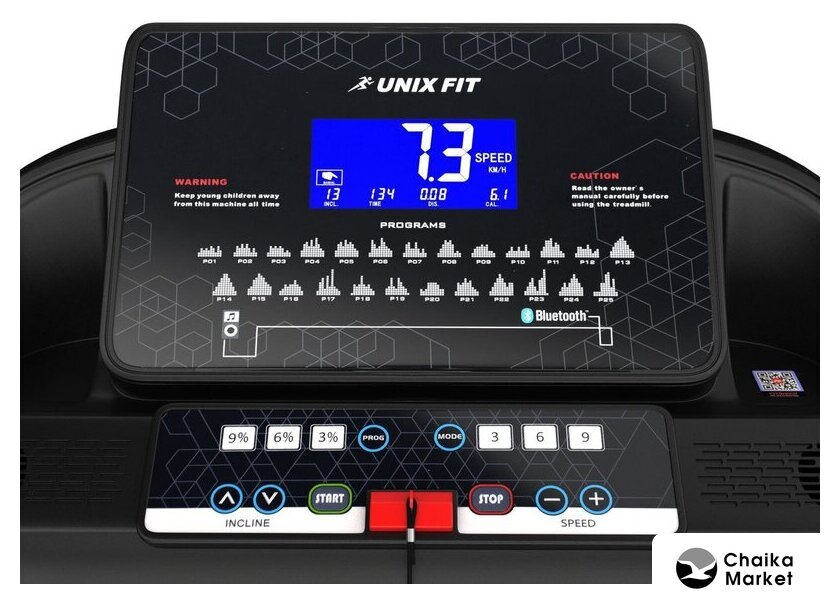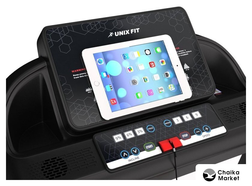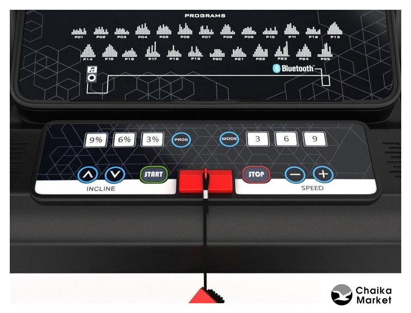 Показания на дисплее | время, скорость, дистанция, калории, пульс, наклон бегового полотна, быстрое переключение скорости с шагом 3, 6, 9 км/ч и переключение угла наклона бегового полотна с шагом 3, 6, 9% |