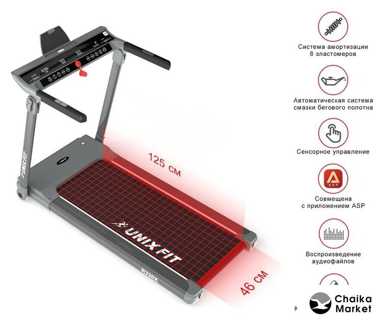 электрическая беговая дорожка, автоматическая регулировка угла наклона, полотно: 45×125 см, скорость движения: 0.8–16.8 км/ч, 15 программ тренировок