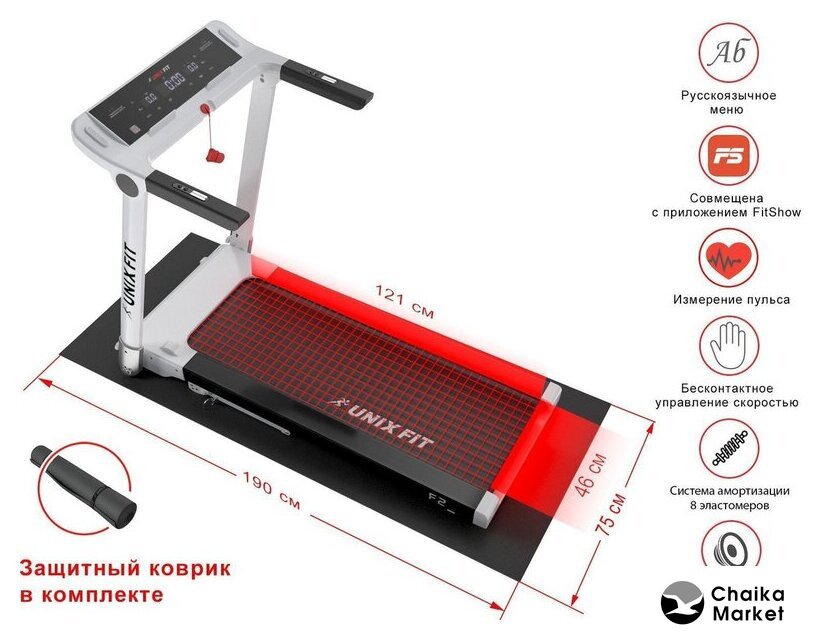 Особенности | Имеется возможность синхронизации беговой дорожки с мобильным устройством при помощи приложения FitShow/Kinomap/Zwfit, с возможностью управления беговой дорожкой и сохранения тренировок. |