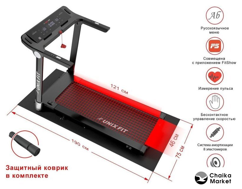 Особенности | Имеется возможность синхронизации беговой дорожки с мобильным устройством при помощи приложения FitShow/Kinomap/Zwfit, с возможностью управления беговой дорожкой и сохранения тренировок. |