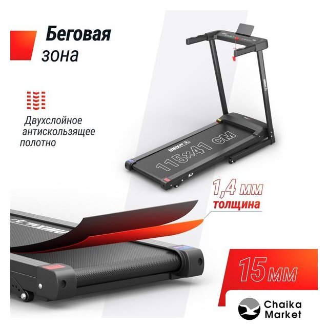 электрическая беговая дорожка, без регулировки угла наклона, полотно: 41×121 см, скорость движения: 1–14 км/ч, 12 программ тренировок