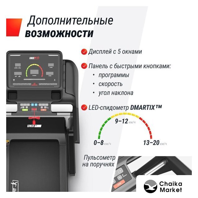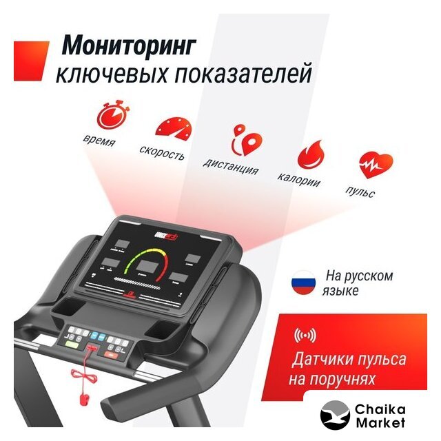 Отображаемая информация | время тренировки, пройденная дистанция, текущая скорость, расход калорий, пульс, угол наклона |