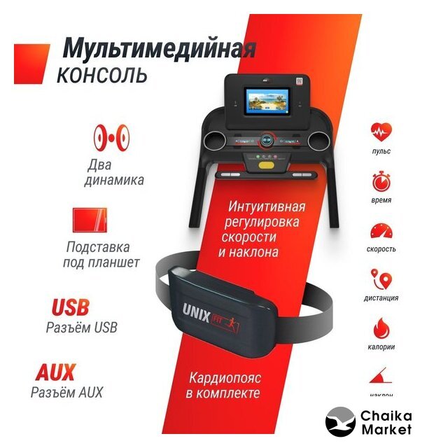 Отображаемая информация | время тренировки, пройденная дистанция, текущая скорость, расход калорий, пульс, угол наклона |