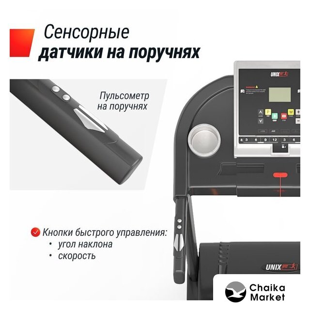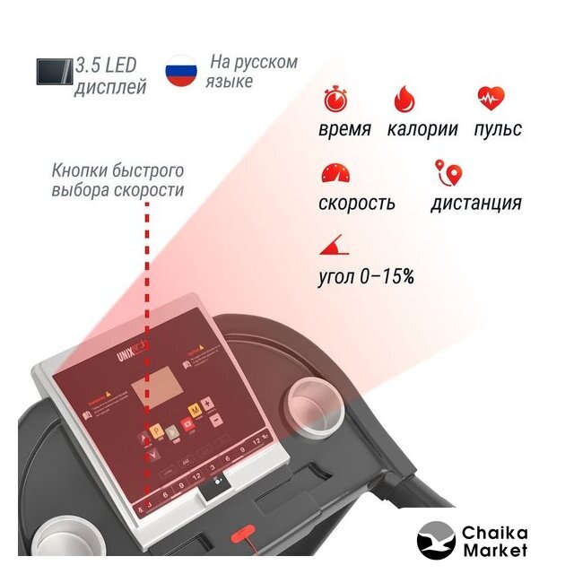 Отображаемая информация | время тренировки, пройденная дистанция, текущая скорость, расход калорий, пульс, угол наклона |