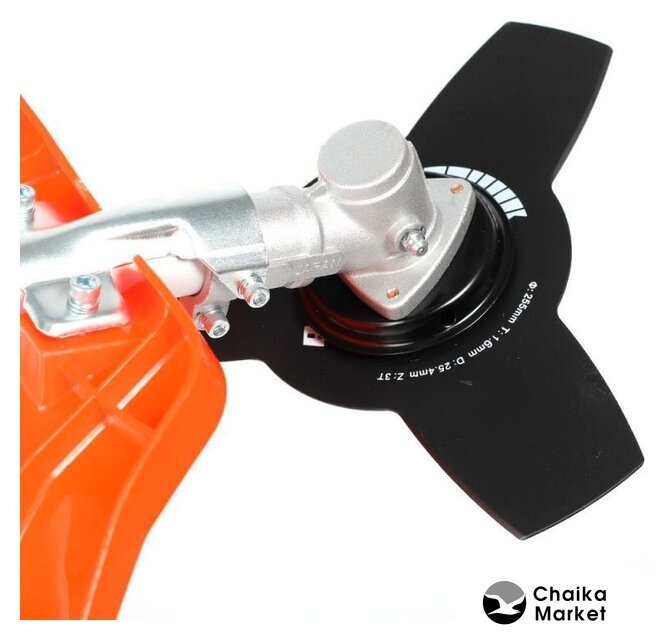 бензиновый, оснастка: леска+металлический нож+металлический диск, ширина скашивания 25.5 см, вес 7.7 кг