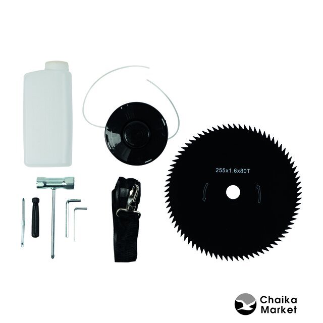 Аксессуары | емкость для приготовления смеси, плечевой ремень, ключ шестигранный Г-образный (2 шт), ключ свечной, ключ рожковый, отвертка, набор крепежа, катушка с леской, нож |