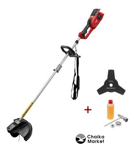 | Аксессуары | - Триммер аккумуляторный- Дополнительная рукоятка- Катушка с леской (установлена)- Нож- Защитный кожух- Барашковый винт- Крестообразная отвертка- Гаечный ключ- Торцовый шестигранный ключ- Монтажный ключ- Плечевой ремень- Масло для смазывания редуктора- Паспорт |