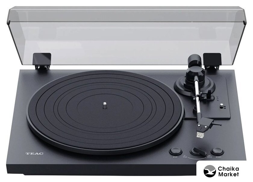 ременной привод, 33 1/3, 45 и 78 об/мин, ручное переключение скоростей, встроенный фонокорректор, тонарм поворотный (изогнутый), картридж с подвижным магнитом (MM), цвет черный