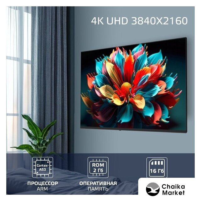 43" 3840x2160 (4K UHD), матрица VA, частота матрицы 60 Гц, Smart TV (Samsung Tizen), HDR10, HDR10+, HLG, AirPlay, Wi-Fi, смарт пульт