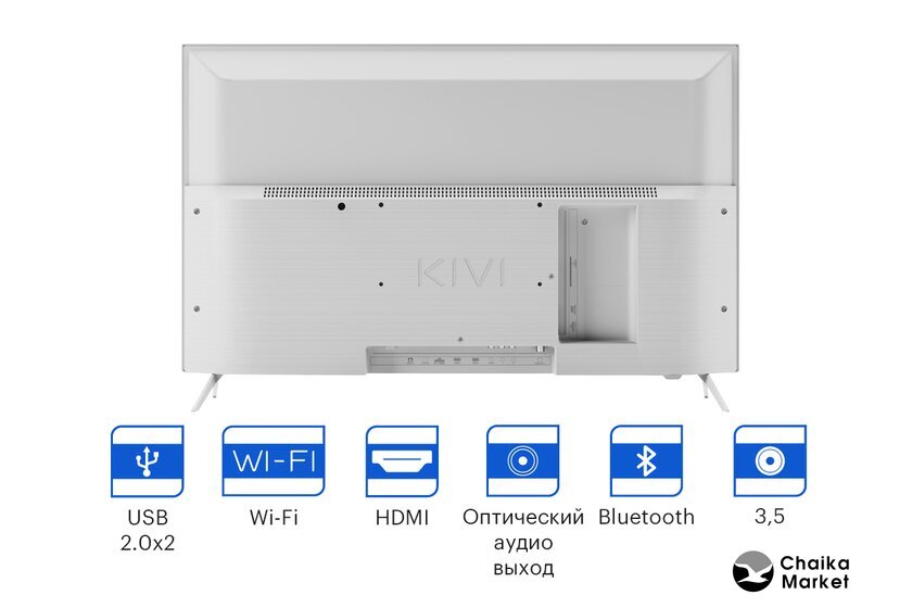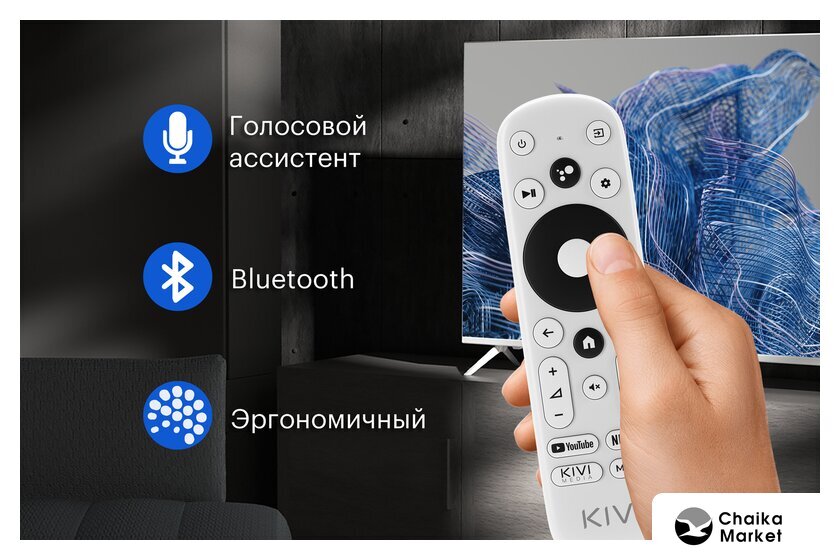 | Пульт в комплекте | KIVI RC40 – серый с голосовым управлением и кнопками Netflix, YouTube |