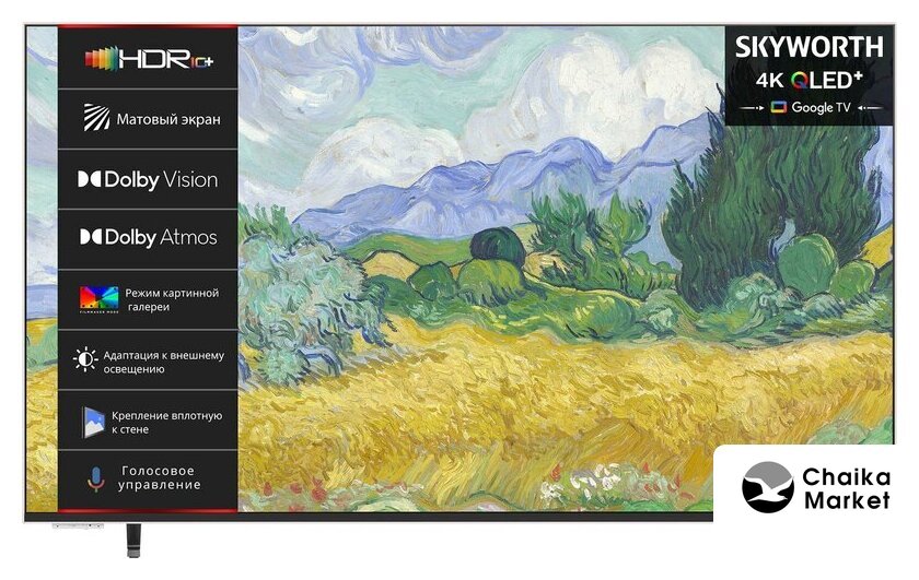 65" 3840x2160 (4K UHD), матрица VA, частота матрицы 120 Гц, Smart TV (Google TV), HDR10, HDR10+, Dolby Vision, HLG, Dolby Atmos, Wi-Fi, смарт пульт